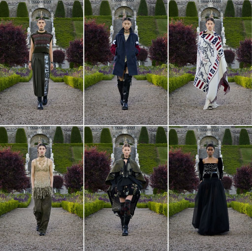 That Maria Grazia Chiuri would be predictable is hardly surprising. Dior’s grand cruise 2025 collection was staged at the grander Drummond Castle, south of the Scottish town of Crieff. Built in the late 15th century and reconstructed in the Victorian era, the private castle is know for its formal terraced garden that is admired for its symmetry and its striking Italianate parterre, with box hedging and copper beech trees. The garden is built into the side of a steep hillside, on top of which the residence was constructed. It was featured in the 1995 film Rob Roy and the 2014 TV series The Outlander. Queen Victoria, who visited the garden in 1842, entered in her diary, “We walked in the Garden which is really very fine, with terraces, like an old French garden.” Unfortunately, rather than complement the clothes Dior presented, the garden dramatically overwhelmed the not-so-fine finery.