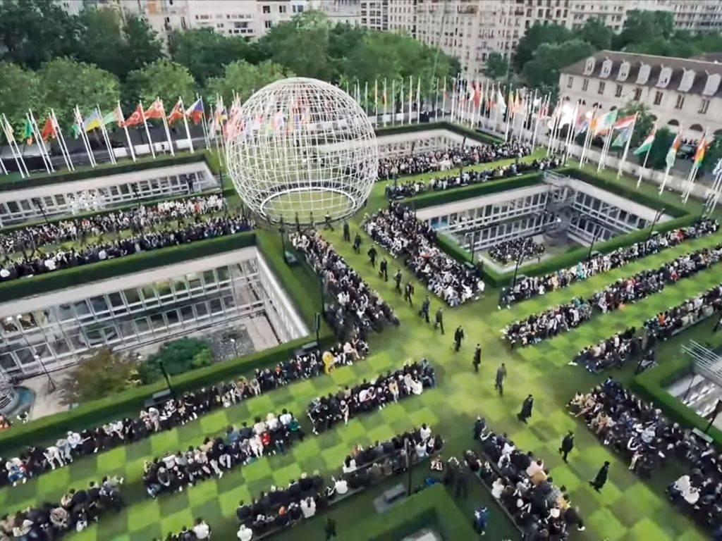 The site nearly consumed the show. But that does not matter. Under Pharrell Williams’s watch, Louis Vuitton shows have to be spectacles. To better drown out the insignificance of the clothes? For spring/summer 2025, a year after his equally theatrical debut, Mr Williams continued to sell himself as the biggest showman of menswear, anywhere. He is, after all, first an entertainer, a Happy crowd pleaser. This season, the runway was sited at La Maison de l’UNESCO, in Place de Fontenoy, Paris, on one of the green sectors of the trapezoidal space that hosts the main building in the shape of a three-point star. The show grounds was marked by the unmissable Globe Symbolique. Drones filming the action below showed a massive space that comfortably accommodated guests and models on the grassy runway made more LV by the checkerboard Damier effect. In the distance, the Tour Eiffel commanded a striking view.