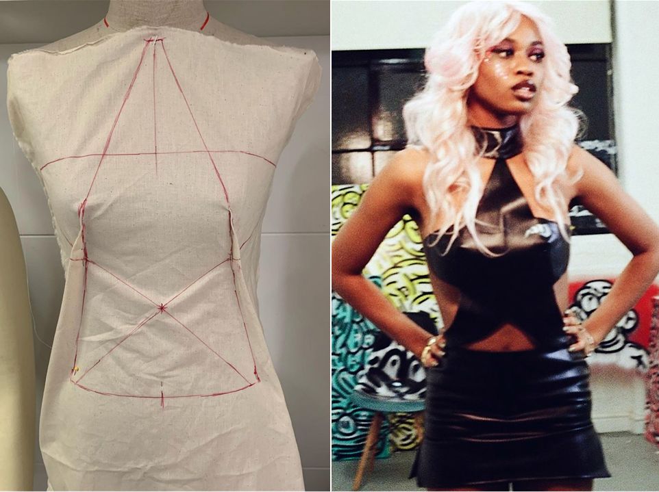 Ms Yang’s original design, as seen in the completed garments worn by those she had loan the top to, is a star-shaped bodice held up by a band collar and is paired with a mini-skirt. Lisa’s version in the Rockstar video is a similar five-point star, but secured to the neck by what appears to be cords. The two bottom points of the pentagram are also attached to cords that further secured the garment to the waist when tied to the back. The top is worn with trousers that looked like fatigues. It seems that Lisa’s is not subjected to the rigours of proper construction. Ms Yang’s version has the part of the star with the horizontal top moulded neatly over the bust. In contrast, Lisa’s is not, which required her to wear a narrow bandeau (that did not match her skin colour) beneath the garment, but it was, strangely, not concealed. Or digitally deleted.
