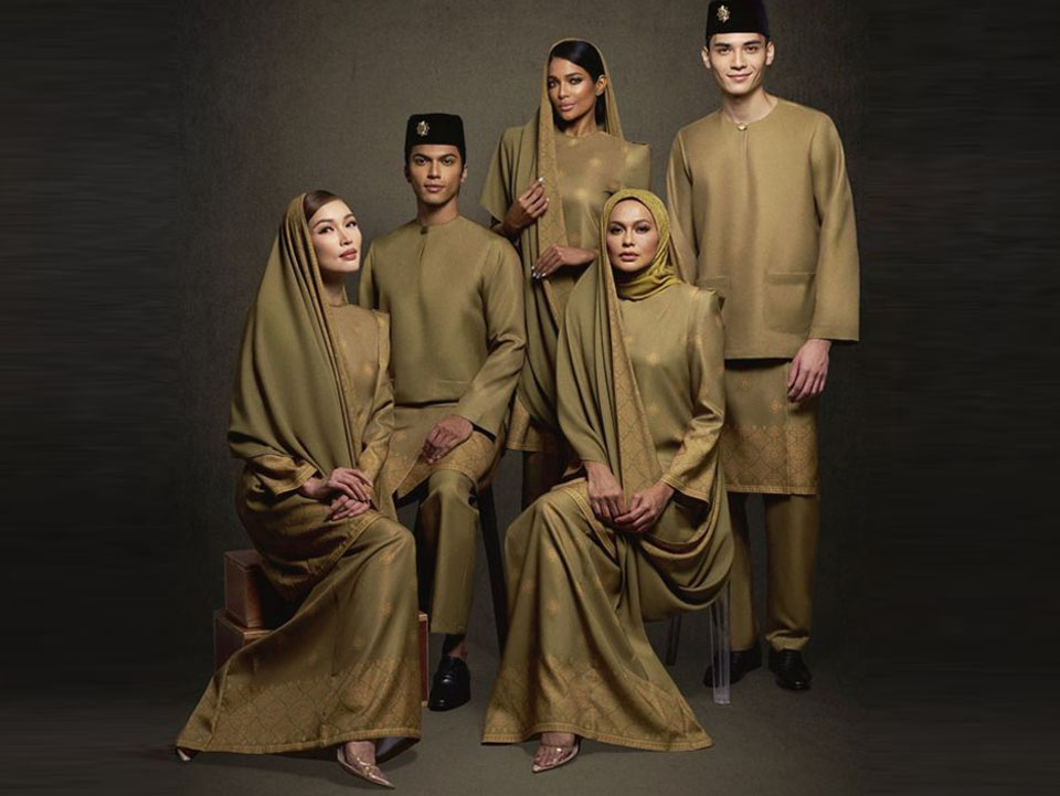 Interestingly, Mr Nordin and Mr Wan Jamili, whose one dress for Naomi Campbell was featured in a Victoria and Albert Museum exhibition about the model, chose to keep the pieces somewhat tradisional and simple, as opposed to their usually more ornamental designs. What is also fascinating is that the duo picked a monochrome theme that is not tethered to the national colours. From the images, the clothes appear to be in an unsummery shade of olive although it has been described as “gold-hued”. The women’s baju kurung—worn with the kain kelubung (or a sarong-like piece slipped diagonally across the body and can be used to cover the head in place of a tudung [head scarf])—and the men’s telok belanga-style (collarless) baju Melayu (including the sampin [short sarong worn over the trousers]) are patterned, tone-on-tone, with motifs typical of the songket, Malaysia’s own brocade. The ensembles are distinguished by their neat finish and the body-skimming silhouettes, a total antithesis to those by trending label Behati.