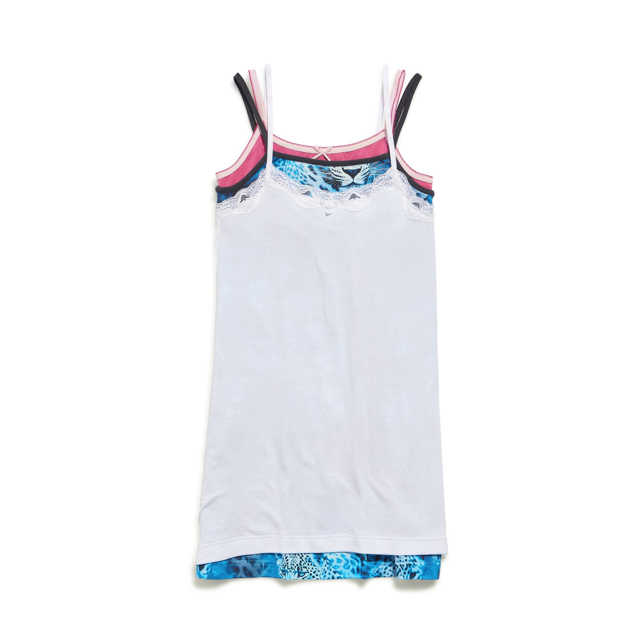 The camisole-dress is styled to look edgy. The top layer is already peeling on the left