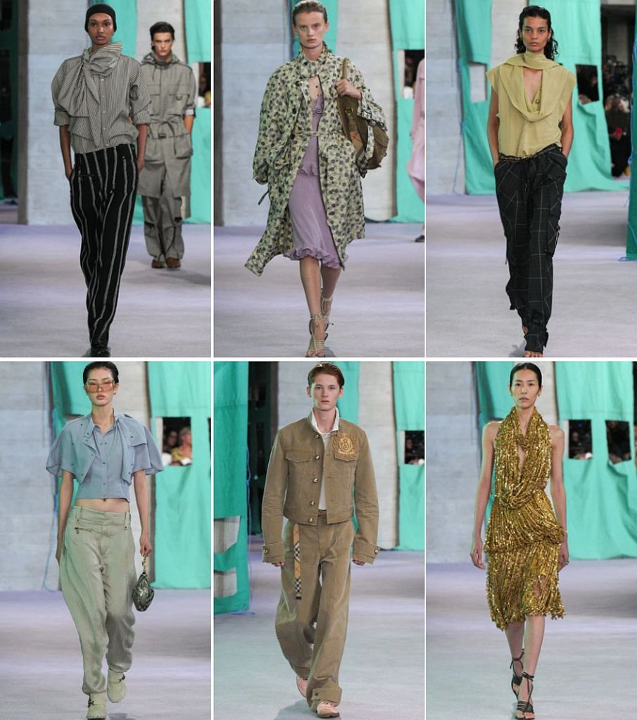 The meandering runway at the lobby of London’s National Theatre was created by the use of tarpaulins with cutouts—in a strange green—placed, as if to set up a field hospital. But this was not the work of military engineers; it was the creation of British artist Gary Hume that was requested by Mr Lee, who wanted something that recalled Mr Hume’s 1990s installation, Bays. The purposely unglamorous set design could be desired to better contrast the practical clothes shown—wearability without a winning way. This was especially obvious in the menswear, in which the outers could have come from Massimo Dutti. Do guys need more truckers, for example, even if they sported a logo atop the left breast pocket? The women’s pieces straddled fussy trench-dresses and flashy date-night dresses, stodgy knickerbockers and floor-length skirts, without saying which wardrobe needed them. As harsh as this sounds, some of the pieces looked destined for Burberry stores in outlet villages.