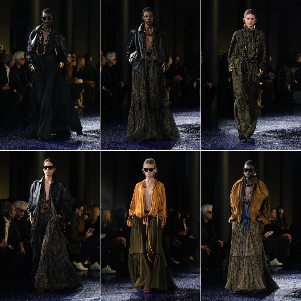 When once it looked as if the models were squeezed into the clothes (often scanty), it now appeared that they could barely fill them up. In that regard, Mr Vaccarello has now kept to the spirit even more of YSL, who never created skin-tight, clingy clothes. Just as his suits were not constrictive, his dresses tended to be flowy and romantically soft. The beauty of the show was how it moved from the menswear that informed Mr Saint Laurent’s womenswear to the pleasant peasant dresses that he was known for (and which Tom Ford did not quite successfully evoke in his revival of YSL in 1999). This time, Mr Vaccarello made them tougher-looking by teaming them with beefed-up leather jackets, but still keeping the romanticism with the generous pussy bows and the swirling, tiered skirts.