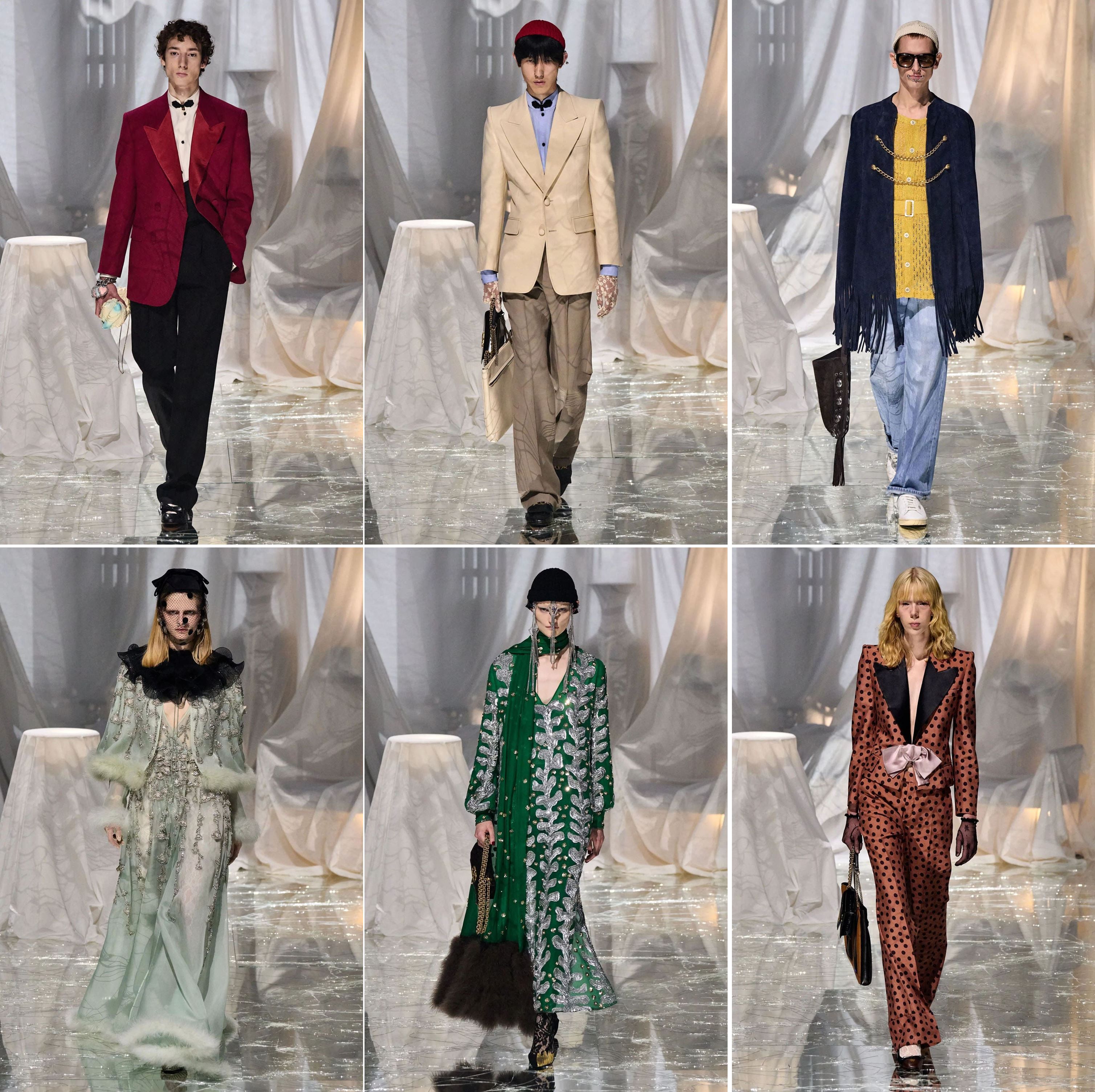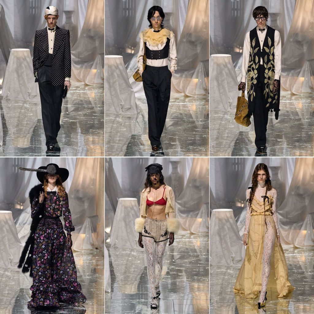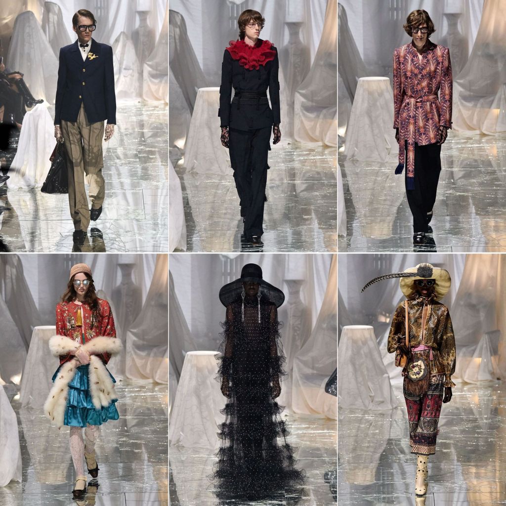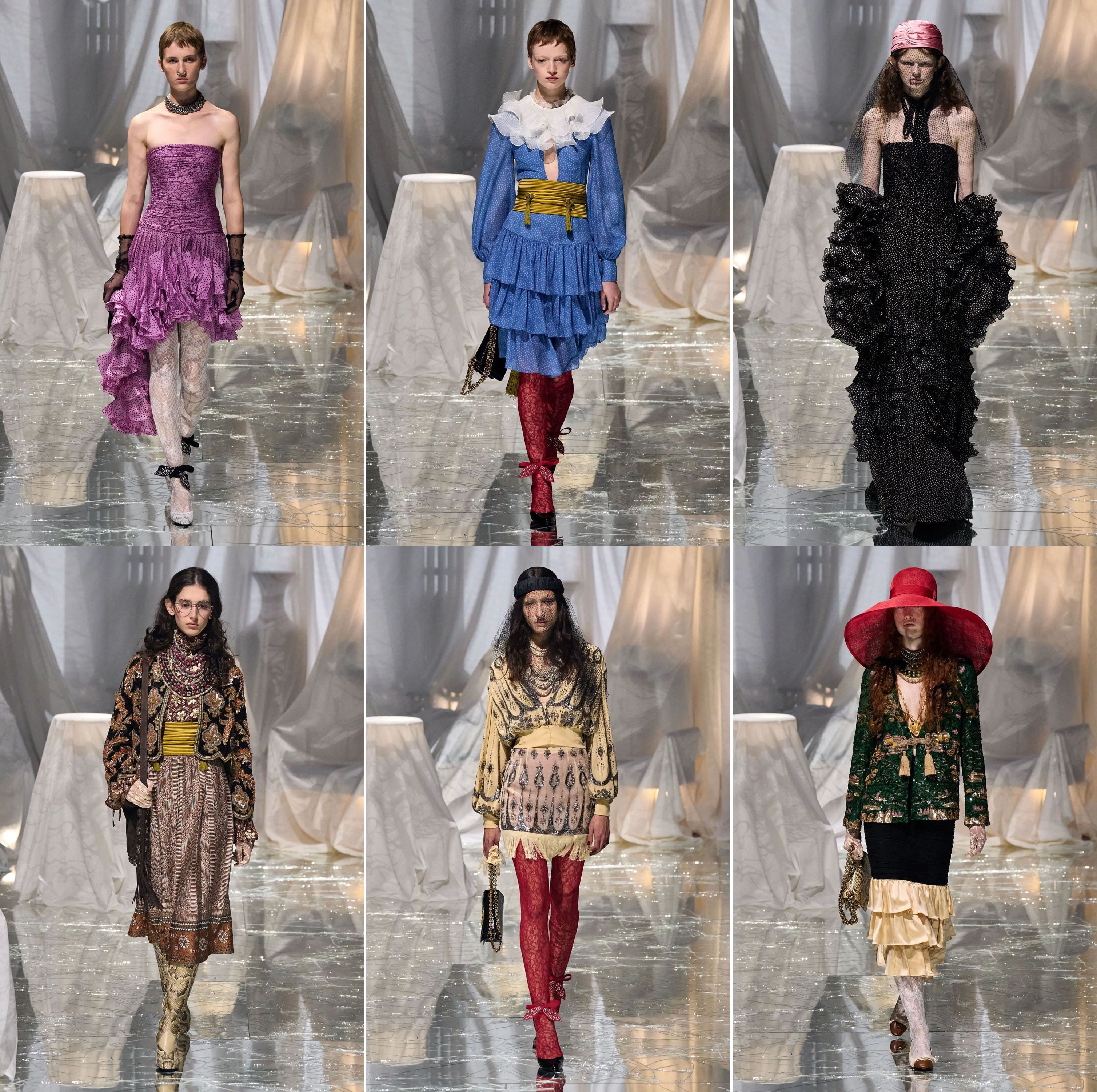 And it was not totally Gucci redux if only because the fit of the clothes were far more precise and the silhouettes generally leaner. Mr Michele could have benefitted from a stronger atelier than the one he inherited at Gucci. But all the structural refinement was lost amid the surfeit of superfluous surface treatment. Some of the evening dresses could really stand on their own without the extra ruffles (or big, floppy hats and the trinket-like jewellery) or whatever shinny cascades that draped over the shoulders. One idea, the layered, gossamer, pleated flounces for the neck, with edges that could have been those of the yunjian (云肩) or cloud shoulder, might have benefitted from a starring role (other Chinese elements used included frog buttons, mandarin collars, and one broad, contrast placket in the style of Qing-era jacket, 马褂 [magua]). But Mr Michele is not inclined to stick to an idea. He needed the world to see that he could juggle many of them and then throw them on the clothes to see which stuck.
