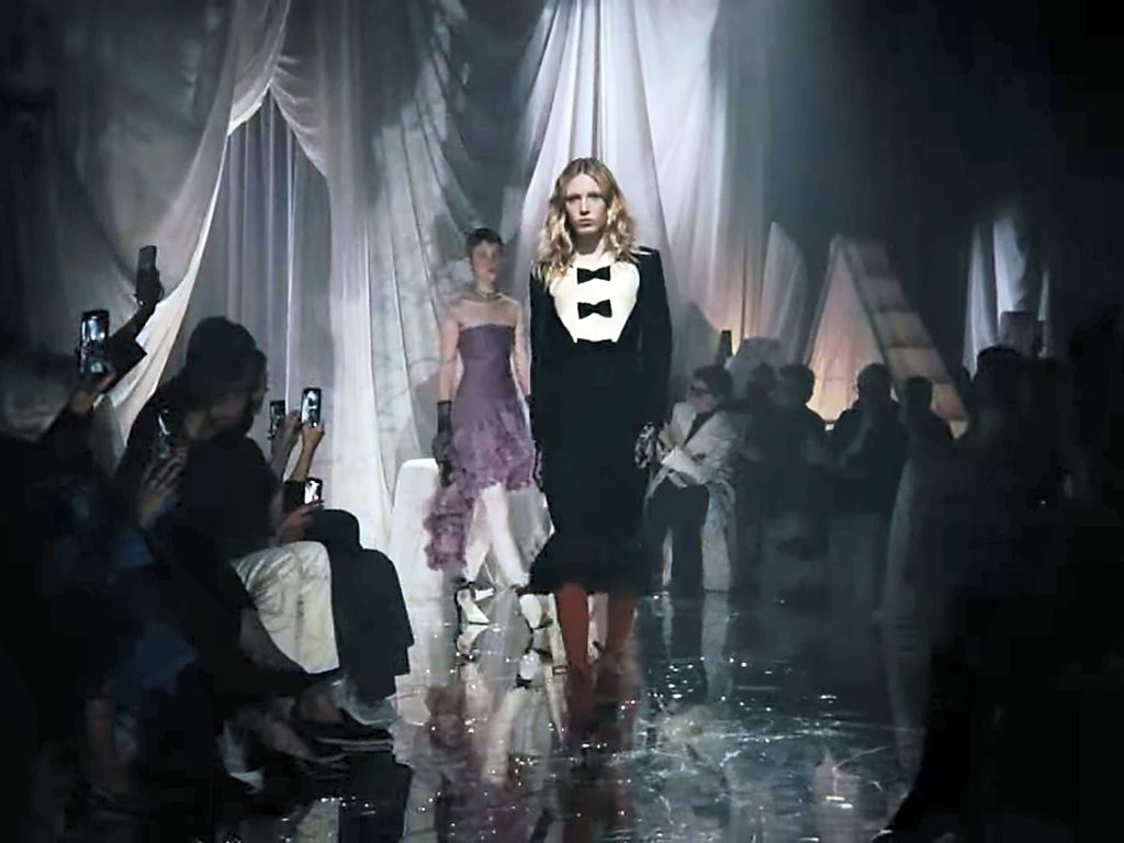 The show was scheduled to start at 3pm (Paris time, or 9pm here), but as expected, it did not. We were treated to 30 minutes of watching the guests arriving, all togged in Valentino, all obligated to pose in front of the photo wall. The walking advertisements for Valentino—predictably, Jared Leto, less so, Sammi Cheng (郑秀文)—already were the prelude to what might appear on the runway, which, unexpectedly, was dark and meandered through seating and what appeared to be furniture, art, sculpture, and lamps draped with white sheets, as if a house—or salon, or Pavillon des Folies (Pavilion of Follies), as Valentino called its show—was closing for the owners to go for a long vacation. Or about to be readied for their return. The space was dimly lit, as if in a cabaret of the past, or to make the clothes less scrutinisable. The floor, a vast expanse of cracked mirror, was auto-upskirt video. The music was as dramatic as the setting, and featured a woman singing one long song in at least three languages.