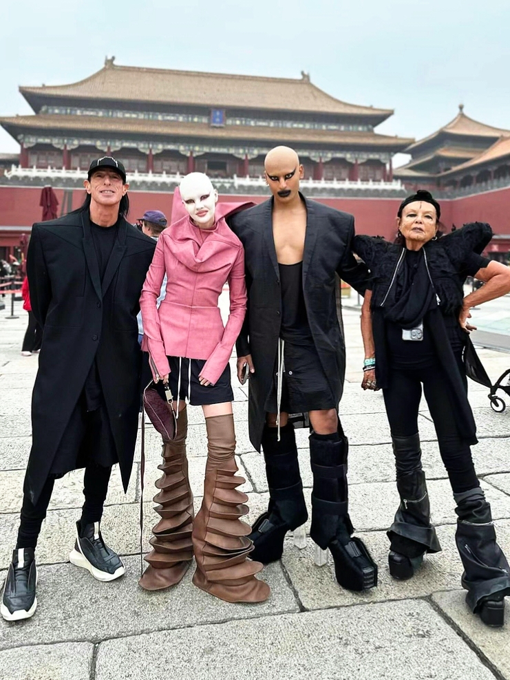 They showed up at the Forbidden City (紫禁城, zijincheng) in Beijing to outdo the tourist site they went to see. But the old palace was no place for fashion iconoclasts. The staffers persuaded them to return after they changed into more acceptable attire. American designer Rick Owen and three others with him were told to “换普通的服装再来 or come back after changing into ordinary clothes”, according to local news reports. Mr Owens was in the former imperial grounds with his wife Michele Lamy and their friends/collaborators, the Montreal-based designers behind Matières Fécales (Fecal Matter), Hannah Rose Dalton and her partner Steven Raj Bhaskaran. The Canadians shared on Matières Fécales’s Instagram page, and described what happened.