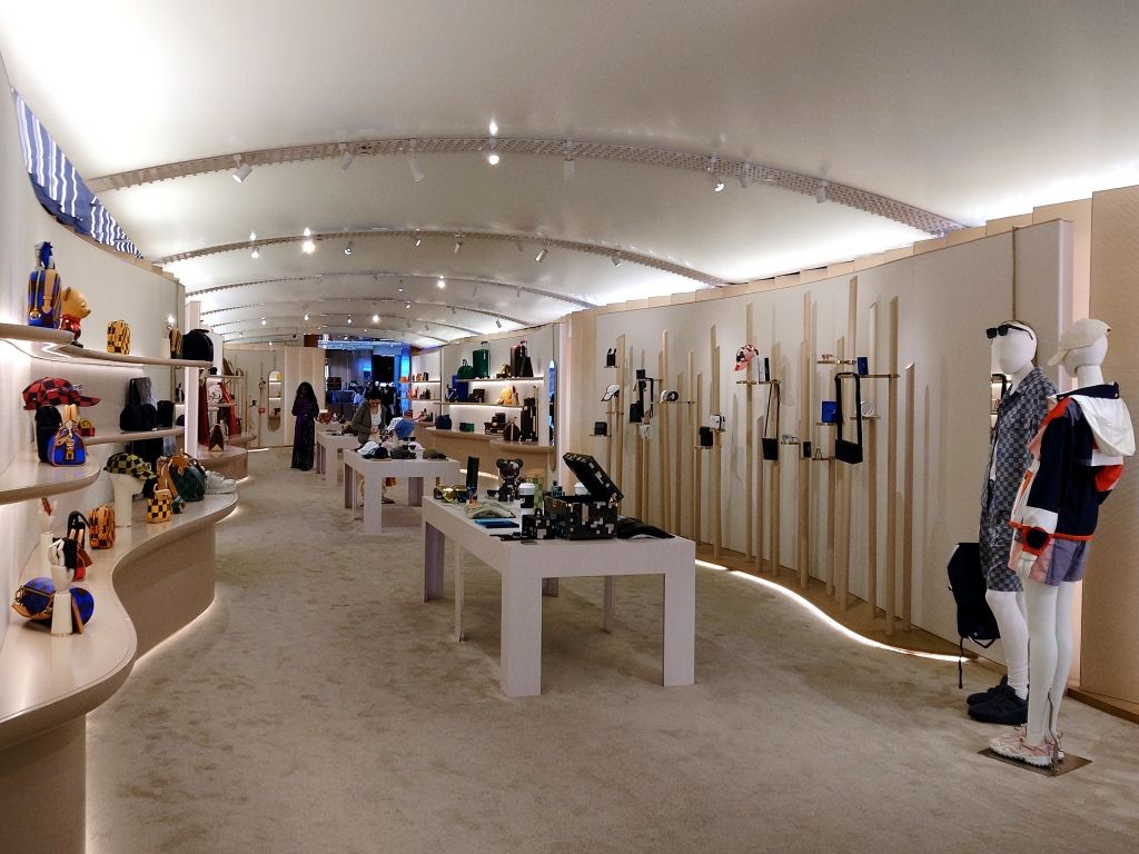 Surprising was how the assorted merchandise was displayed: on plain, unremarkable, long, white tables, placed lengthwise in the centre of the tunnel-conduit that links the store’s entrance at The Shoppes at Marina Bay Sands side to the Island Maison. There were four such tables, filled with all manner of mid-sized or small items that would make wrappable gifts, from mini trunks (in Farrell William’s pixelated camo-print) to reusable coffee cups (with sleeves) to eyewear to bucket hats and every imaginable SLGs (small leather goods).