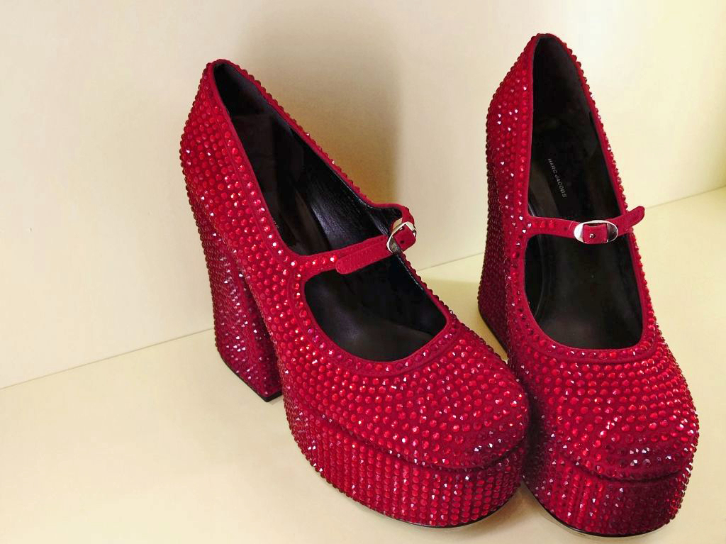 When we spotted the the brick road of yellow, it was not made of bricks, but, plush carpet, marked out to be that pathway, but looked like something from a playground in, say, 南山邨, the residential estate of Nam Shan Chuen. By contrast, the walls of the interior were gleaming in lacquer red. And mere steps from the entrance was one side of the iconic ruby slippers—heeled, vertiginous, and as big as a playground slide. The actual wearable shoes that could be purchased were the sequined Kiki Platform Mary Janes (S$885), seemingly designed to appeal to participants RuPaul’s Drag Race, nothing Dorothy could wear and dance in throughout the movie-musical. As for the tribute merchandise, they were mostly images/graphics from the film applied on what is largely the brand’s staple pieces. Strictly for the film’s fan, such as Mr Jacobs himself.