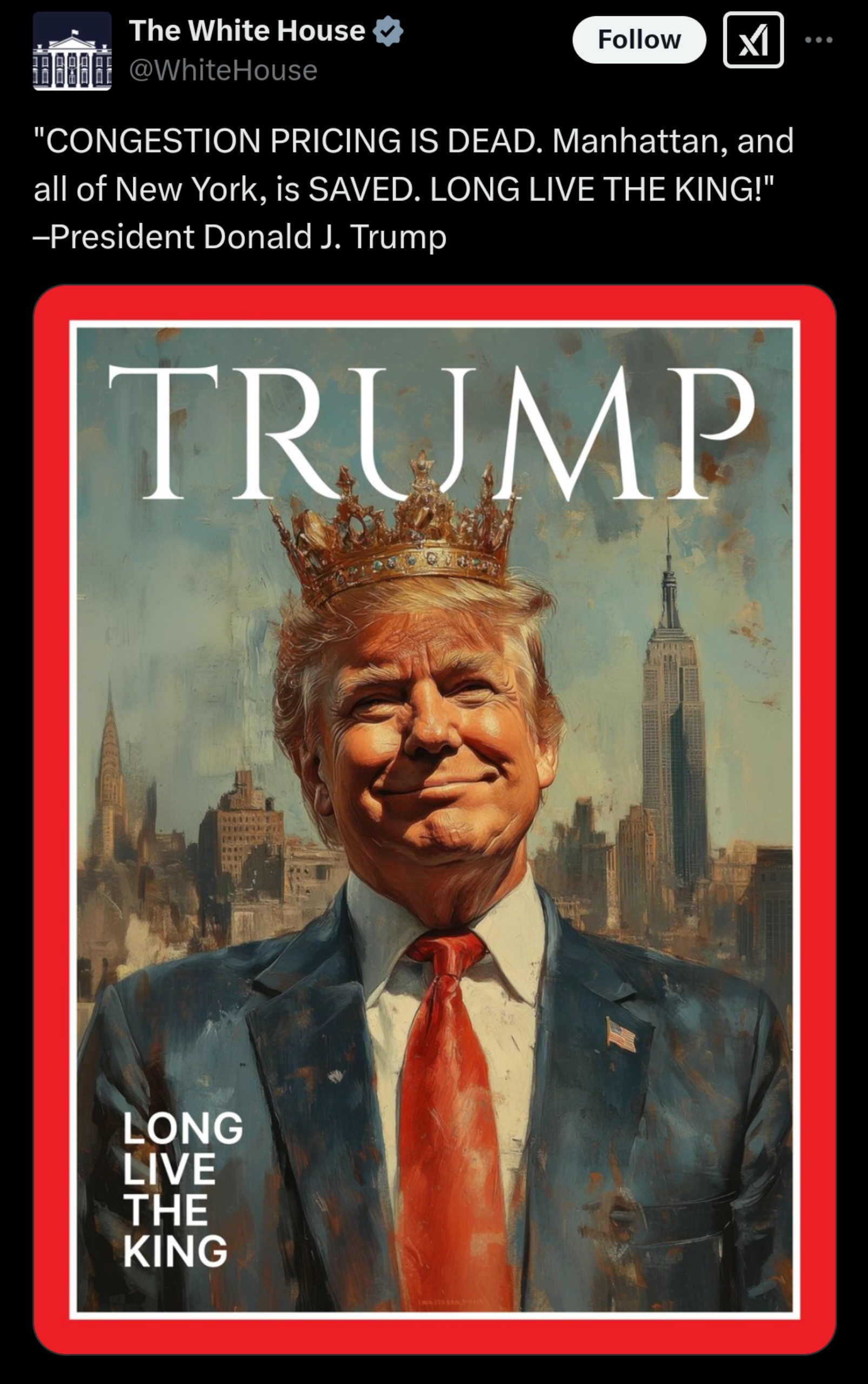 CONGESTION PRICING IS DEAD. Manhattan, and all of New York, is SAVED. LONG LIVE THE KING! —President Donald J Trump