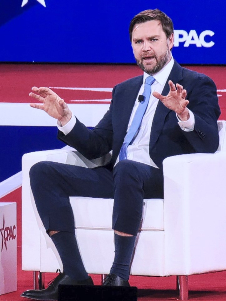 Although he has tried to express his gratitude for the opportunity he was given by dressing like the fellow who made it all possible, there could be moments, now that he has secured his place in the White House, that he wished to look less identical. Before he entered the political arena, Mr Vance was said to have dressed like any tech bro. And then to win MAGA approval, he started adopting natty suits, which, according to The New York Times, were made by a Cincinatti tailor. Is the guy over-inspired by Thom Browne? It is quite a sight to see, there on stage, host Mercedes Schlapp—former White House director of strategic communications—in a suit too, but with trouser-legs far wider than the VP’s. Was this a sartorial oversight on the part of JD Vance or the zealous cost-cutting measures of annihilating DOGE that even affected the amount of fabric used for his trousers?