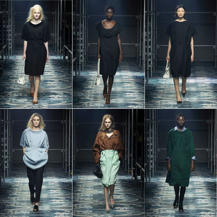 And, initially, you couldn’t really see Prada’s technical finesse in those black dresses, worn with the cant’t-be-bothered attitude of women who potter about in house coats, even going to the corner store. But further down the line-up, lighter-coloured dresses in the same aesthetical vein, revealed fascinating details and proportional control that would delight even the most conservative pattern-maker. We are talking about the shaping of the bodice while keeping the waist loose, the pleating that formed some kind of reversed parenthesis for flapped pockets, the U-shaped waistband that seemed to catch the pleating from the neckline, the sleeveless fit-and-flare tops bunched up at the cleft of the chest, the gathered skirts that appeared to be poorly-made cartridge pleads… we could go on. The collection was a patterning wet dream!