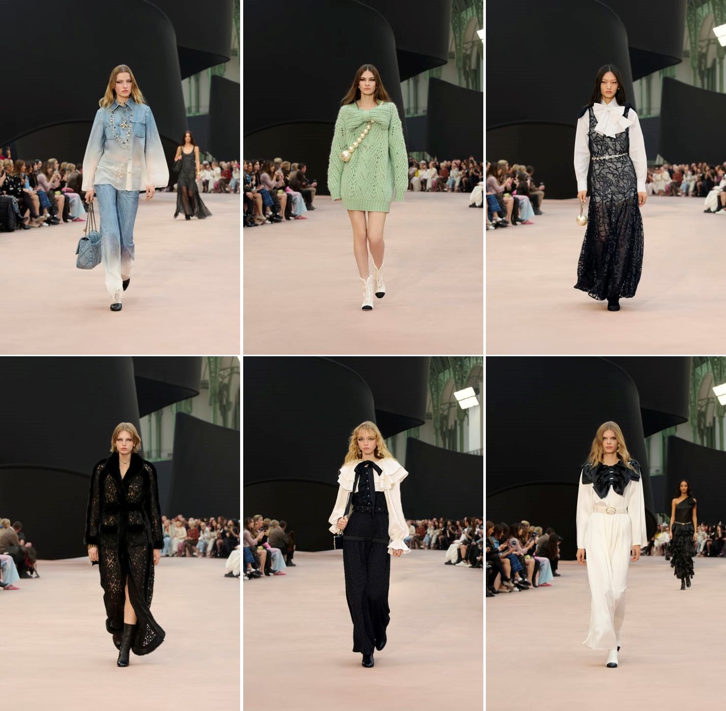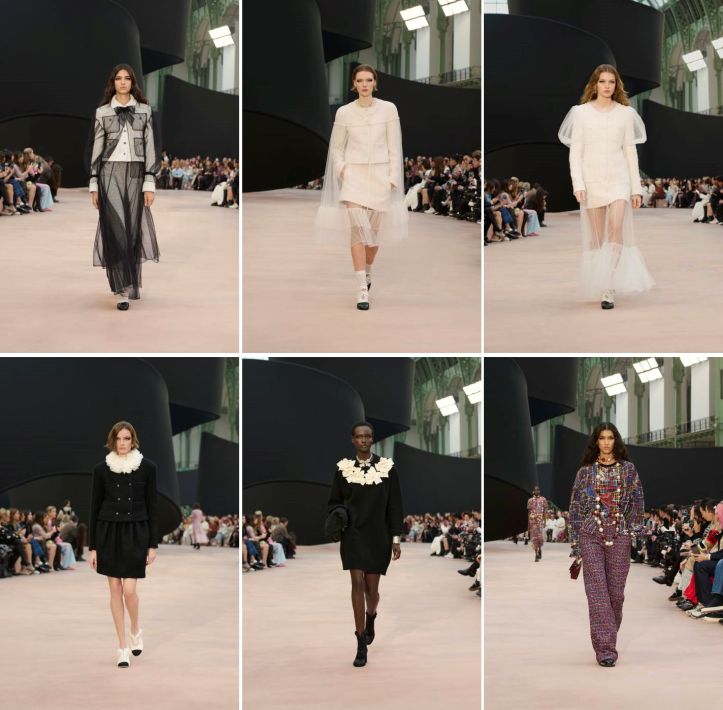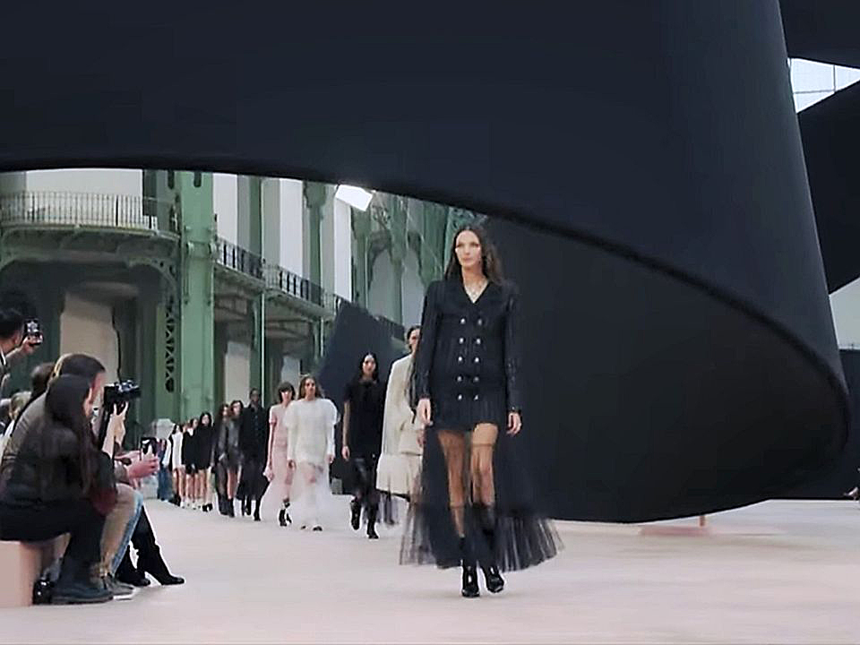 But they went for it, with a presentation at their favourite Grand Palais. The set was a nod to the rubans (ribbons) Chanel uses as trims and other decorative touches on their clothes and accessories. A thick, stiff black piece, reportedly measuring some 20 metres, meandered through the cavernous nave; at one end, spiraling towards the glass barrel-vaulted roof. It marked out the show space like partition panels, as if a wake was to be held within. This would be remembered for one of Chanel’s lamest sets. While there was no mise en scène in the stripped down affair, the soundtrack was a curious jumble of the neo-classical (movie soundtrack?) for the opening to techno dance beats such as Canadian composer Daphni’s Fly Away and Faithless’s Insomnia, and then back to Fly Away and the percussion-free swirl, before Sash’s Encore Une Fois (Once Again) for the finale, all in a monotonous thump of Beng party drone.