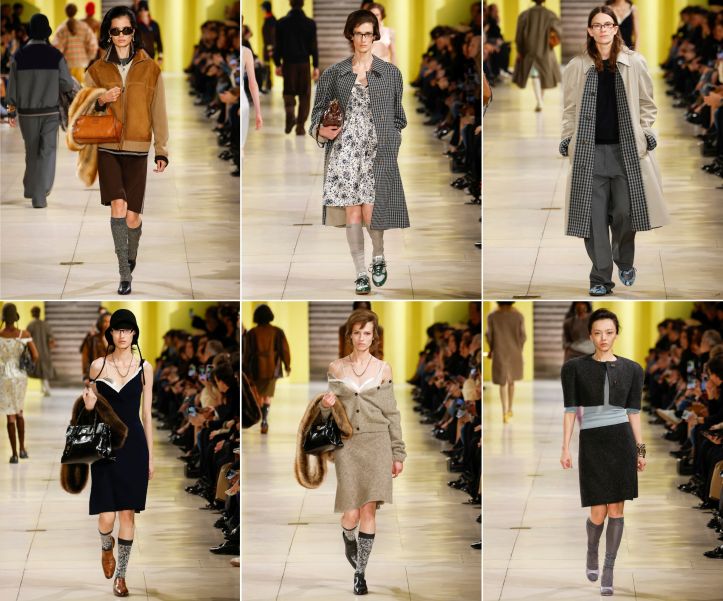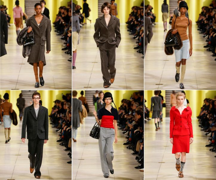 Looking back at the past (especially the schoolyard of students and teachers) included calf-high stockings, knee-length skirts (A-line, too), and polo-style pullovers with skewed front opening. These were worn with more grown-up pieces such as waisted jackets, leather outers, and additional cardigans, all made lady-like with handbags swinging from the crook of the arm, where fur stoles hung, too. Just as appreciable were the not-one-look make-up and varied hairstyles, including those ‘salon hair’ coiffed and held in place with—in our mind—Helene Curtis hairspray. The pleasure of a Miu Miu show! It is not how challenging the clothes are, but how they’re able to arouse the imagination and, concurrently, provoke thought and question current views of fashion aesthetics. And, in Paris, within the Art Deco handsomeness of the Palais d’Iéna, they did it again.