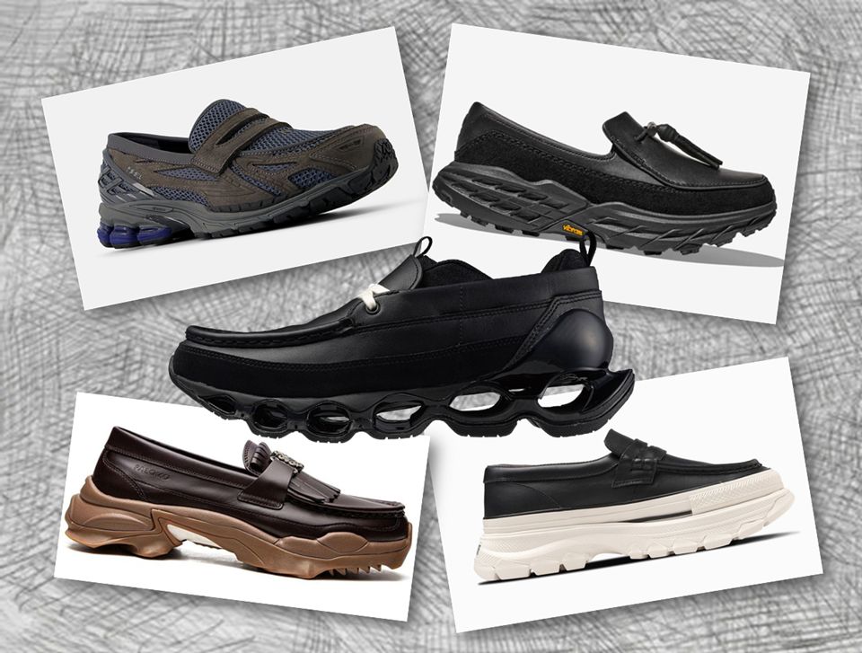 Snoafers rising (clockwise from top left): New Balance 1906L, Hoka Speed Loafer, Converse All Star Trekwave Loafer, Paloma X Puma Nitefox and (centre) Mizuno Wave Prophecy Moc. Product photos: respective brands. Collage: Just So