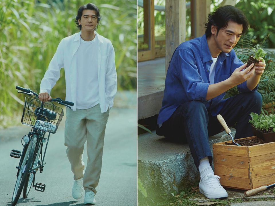 In the latest ads, Mr Kaneshiro is fitted with supremely basic clothes, featuring the fabric 汗麻 (hanma), a type of linen made from hemp grown in Heilongjiang (黑龙江), northeastern China, known for their agriculturally important black soil. Accompanying the images is a short, video (seemingly a making-of-style clip) that showed the model—or the character he plays—enjoying tranquil pastoral life, wearing the Muji pieces as if they are his everyday attire, wrapped in a soothing soundtrack that included birdsong and the clink of wind chimes. Takeshi Kaneshiro is seen admiring the natural surroundings and then planting what looks like vegetables (there is even a harvest of freshly pulled-from-the-soil carrots). He was happy, he was at peace, he was even tasting the greens; he was down-to-earth, naturally.