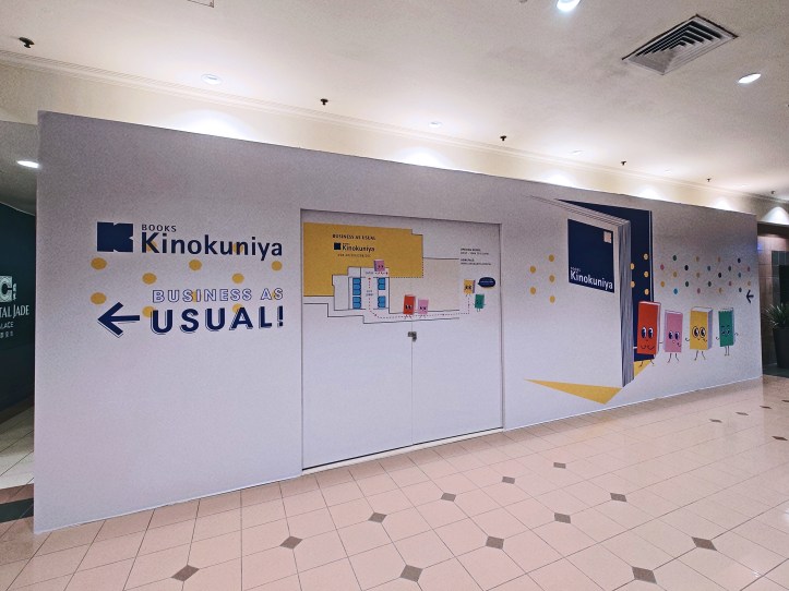 The entrance of Kinokuniya facing the main atrium of Ngee Ann City Shopping Centre, now boarded up