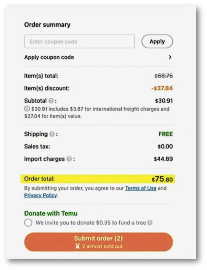 But while Amazon was willing to let a president influence an essentially commerical consideration, other e-tailers were ready to go ahead to clearly spell out what shoppers would have to pay in terms of Mr Trump’s tariff orgy. One of them is Temu. CNBC reported two days ago that the Chinese e-commerce platform included the tariff amount in their check out page, using the less-alarming term “import charges”. A receipt (top) shared in the report showed a total price for two items purchased—a kid’s swimming costume and an adult sundress—US$31.91, not including the staggering $44.89 in tariff charges. Showing the tariff breakdown is offering pricing transparency to customers. If Amazon already lists the sales tax separately in the final billing, showing the tariff paid is no different.