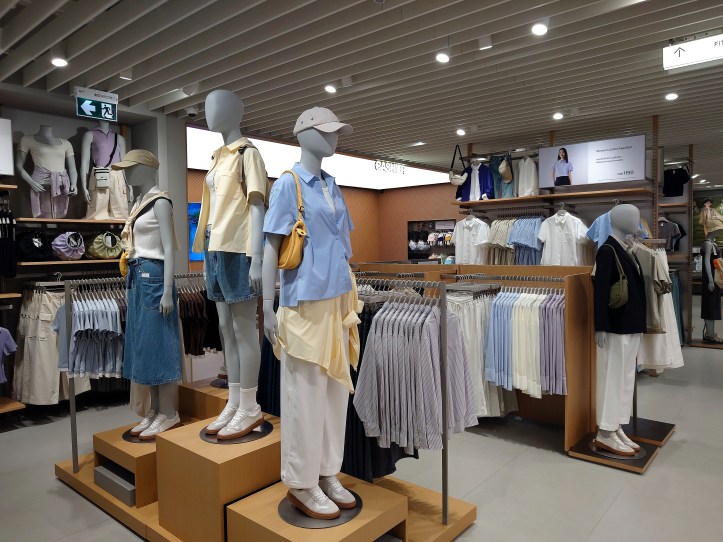As of late August 2024, Benlai had 16 stores in major Chinese cities, including Beijing, Chengdu, and home Guangzhou. FMG chairman and CEO Leo Li told the Thai media that the company has set a target to expand to more than 200 branches worldwide—including SEA—within the next 5 years. There is no mention yet that Singapore will welcome a Benlai store soon. Despite its clearly Chinese-sounding name (as opposed to, say, Urban Revivo) and a curious green box-logo that is somewhat reminiscent of Benetton, Benlai, in terms of interior, is a cross between Lululemon and Japan’s Uniqlo, but with far less crammed layout than either of them. The store is zoned into areas for men, women, and kids.