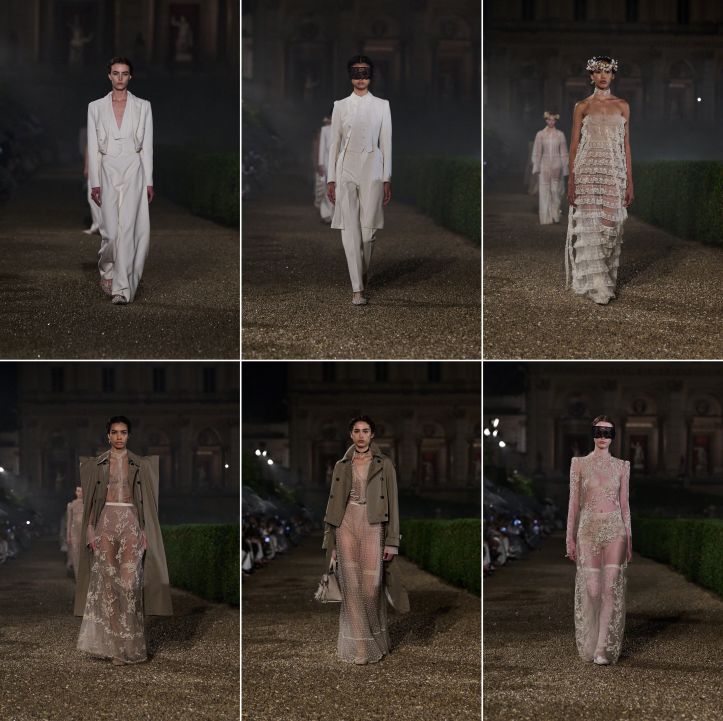 The choice of the cinematic presentation (even when there was an IRL show for guests) oddly came at a time when, at the just-concluded Cannes Film Festival, “nude dresses” were banned on the red carpet. Ms Chiuri showed such dresses, more than ever before. Of the 80 looks, at least 56 revealed the body underneath (or hinted at it through vaguely trompe l’oeil effects). If this was indeed her swansong, Ms Chiuri was probably more concerned with setting the narrative of her last collection than with the specific dress code of a single film festival, although one that shares the same sol as Dior. There was a surfeit of lace, as well as her usual love of unstirring and muddy colours, within which was the unsurprising counterpoint of military styles. And those lean silhouettes she has favoured at Valentino. It is rather telling that, despite the media’s praises of “beautiful” and “ethereal”, many reports dwell on the expected attendees, such as Natalie Portman and Rosmund Pike.