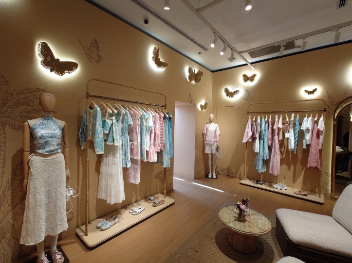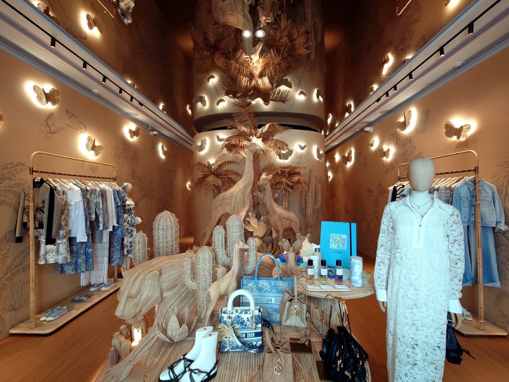 The store is not your usual Dior boutique, with spaciousness that stood aloof from their customers. Once we entered after the front door was held ajar for us, we were in the foyer of the mansion, and abruptly thrown right into the immediate selling floor, which comprises the main display and the menagerie of the rattan animals in the rear, flanked by two racks of merchandise. The confines are designed to appeal to women, not only with the merchandise, but also the decor, a holiday-villa-in-Tanjung Bungah vibe, with back-lit butterflies, also in rattan, dotted on the walls with etchings of palm trees, all bathed in incandescent glow. We sensed that the prettiness is intended to underscore the commercially feminine clothes that could pass off as merchandise of Parkson department store, on a good day.