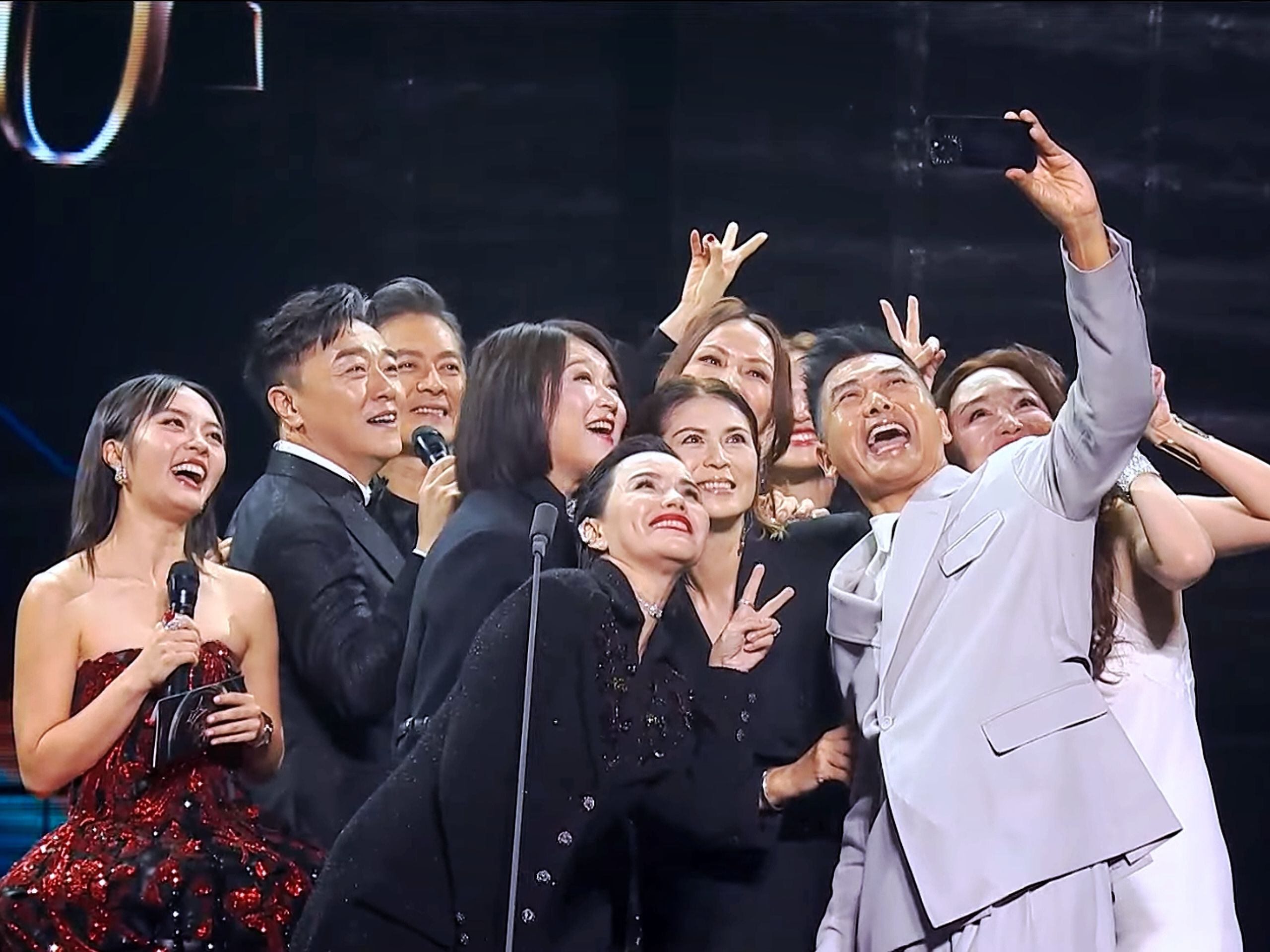 The by-now most-talked about segment of the evening, with Chow Yun Fat holding his smart phone. Chantelle Ng clearly did not belong
