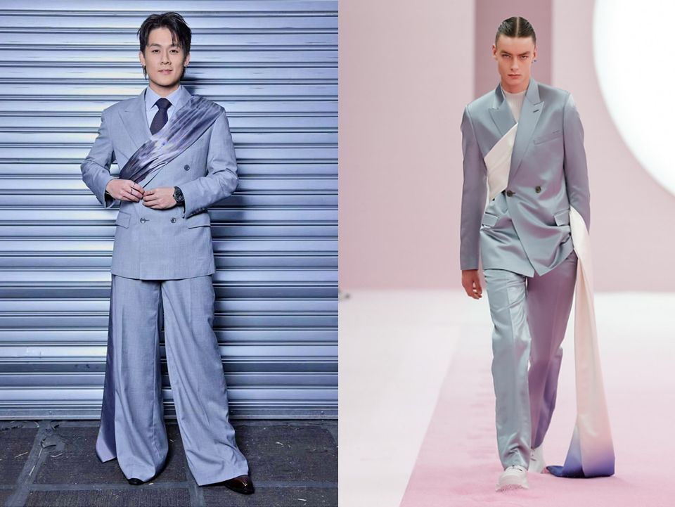 But as Mr Koh took to the interview platform and was about to face innate questioning by one of the co-hosts, the trying and goofy, and towering Hermen Keh ((郭坤耀, Guo Kunyao), it dawned on us that we have seen the sash similarly styled somewhere else. To be precise, in the spring/summer 2020 Dior collection designed by the maison’s former creative director Kim Jones. That season Mr Jones’s use of sashes stood out. WWD, we recall, described it as “flamboyant”. We thought it looked rather swish. Unlike the sashes seen on beauty contestants, however, Mr Jones styled his on the left shoulder, beneath the jacket, rather than draped across the front.