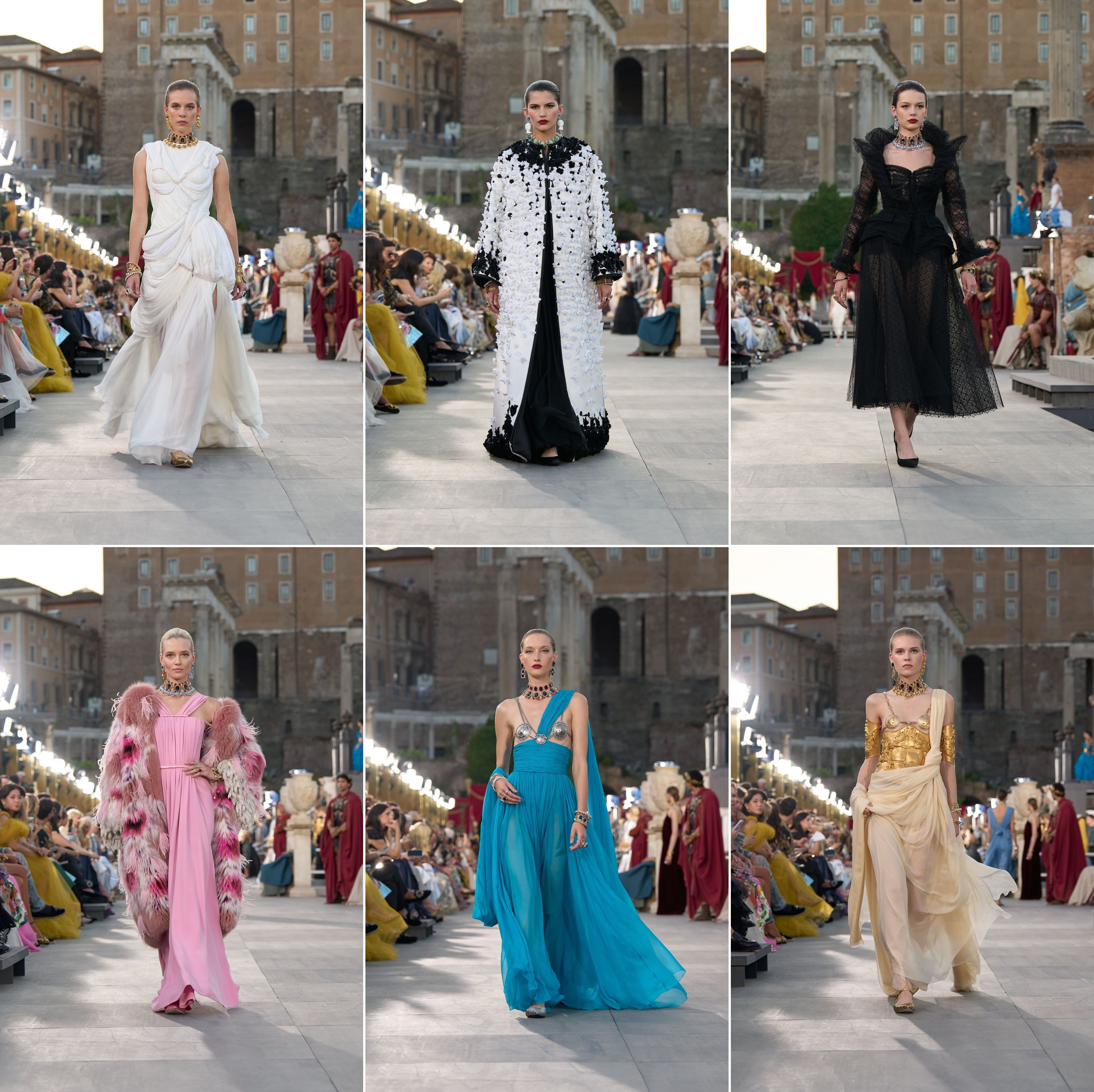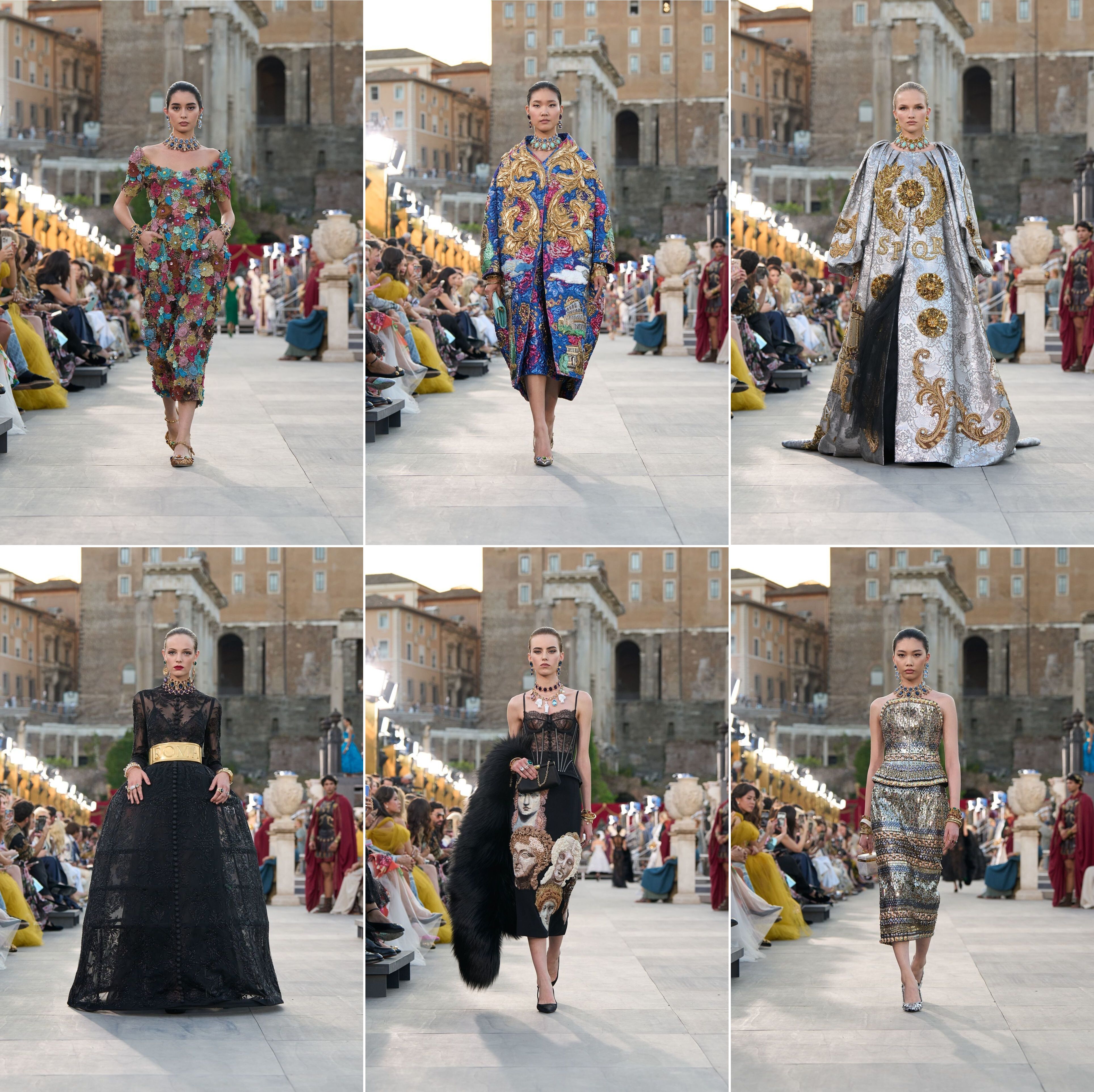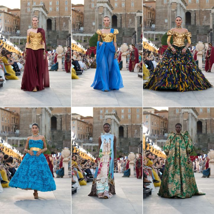 Dolce and Gabbana has been enjoying a terrific summer. Among the many events and activities the brand has created to maintain visibility, there is the Dal Cuore alle Mani: Dolce e Gabbana traveling exhibition that opened in Paris in January and is in Rome now. And perhaps the most visible, that “intimate” Venetian wedding, not enjoyed by the many locals trying to navigate the canals without dodging flotillas of celebrity water taxies and paparazzi boats. And now, the brand’s alta moda autumn/winter show in the capital city, right in the Roman Forum, a sprawling ruin, once a marketplace, that now attract millions of sightseers yearly. The transformation of the Forum into a runway immediately crumbles its historical importance and perceived authenticity. The ancients clearly built the complex with future fashion shows in mind.