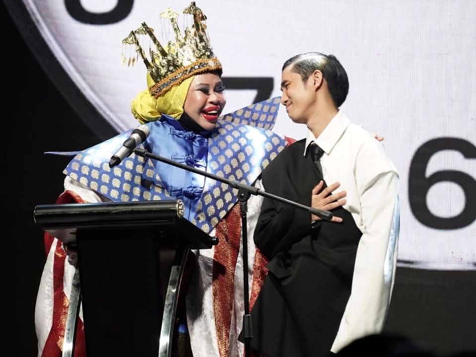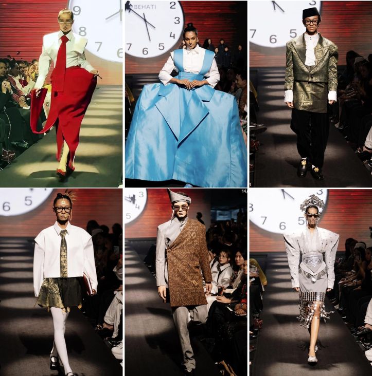 In the makeshift KLFW tent at the Esplanade of Suria KLCC, it was less a revolusi than a mild commotion of models getting into place. Instead of the rousing Les Miz anthem, they went about their catwalk duties to the tune of Mimifly’s Raya hit of this year, Serumpun (Malay for ‘of the same root’). The song’s core message of unity and togetherness sat as a comfortable bedfellow to Behati’s penchant for ethnic details, traditional silhouettes, and exaggerated proportions, cobbled together in individual looks. This was Mr Tan’s independence—do as he pleases, as capriciously as possible. To support this creative madcap merdeka, the influencer/beauty mogul/crispy salmon skin seller, Seri Vida, came on stage, wearing a crown and an outfit that seemed to be a deconstruction of the Malaysian flag, to cheer him on. In her famous pasar demeanour, she cackled: “mix and match Malaysian fashion in all one design”, before leading three cheers of “merdeka”, as a headmistress would, during primary school assembly. Was this a rallying call for defiance or a clever spectacle of defiance?