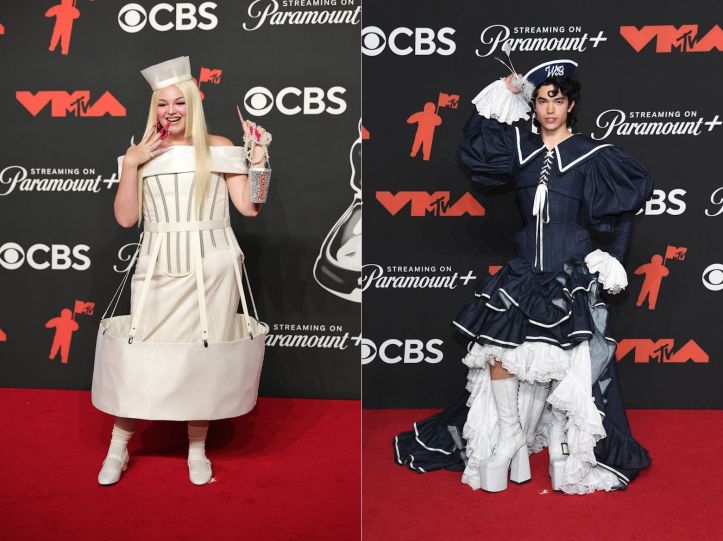 Every red carpet has its share of clowns, and this year’s VMAs delivered on that front with Meg Stalter and Conan Gray. Ms Stalter, known for her offbeat persona, showed up as a nurse in an oversized ensemble with a rhinestone-studded Dunkin’ cup—a look that was less about fashion than her as a walking, talking sight gag. Meanwhile, Conan Gray took the nautical theme of his new album, Wishbone, to show what the tide dragged in: a full-length gown by Erik Charlotte complete with puff sleeves, a corseted bodice, ruffled hem that could not decided whether it was sailor or pirate-inspired. Whether their outfits were ridiculed or talked-about, these performers understood that at the VMAs, the line between fashion icon and village clown is a thin one, and that a willingness to be the latter may ironically make one the former.