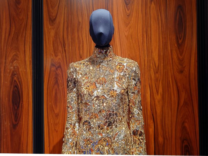 At the entrance, inconvenienced by stanchion and rope, a suited staffer asked if we had an appointment. Do we need one? “We can serve you better if you have,” he replied. You don’t have to serve us better then, we grumbled in our heads. And with telepathic quickness, he said, “okay, you can go in”. We spotted a cameraman; we avoided him, and soon heard him behind us, asking visitors: “Would you like your photo taken?” Our eyes immediately caught the tableau to our left, the costumes of The Tiger, freshly exhumed. So this is what fully submerged in glamour looks like. We were immediately drawn to the one unmistakable gold dress, hermetically sealed in sparkle. In the film, Barbara Gucci, played by Demi Moore, wore the number as she succumbed to hysteria/madness, aggressively bedazzled.