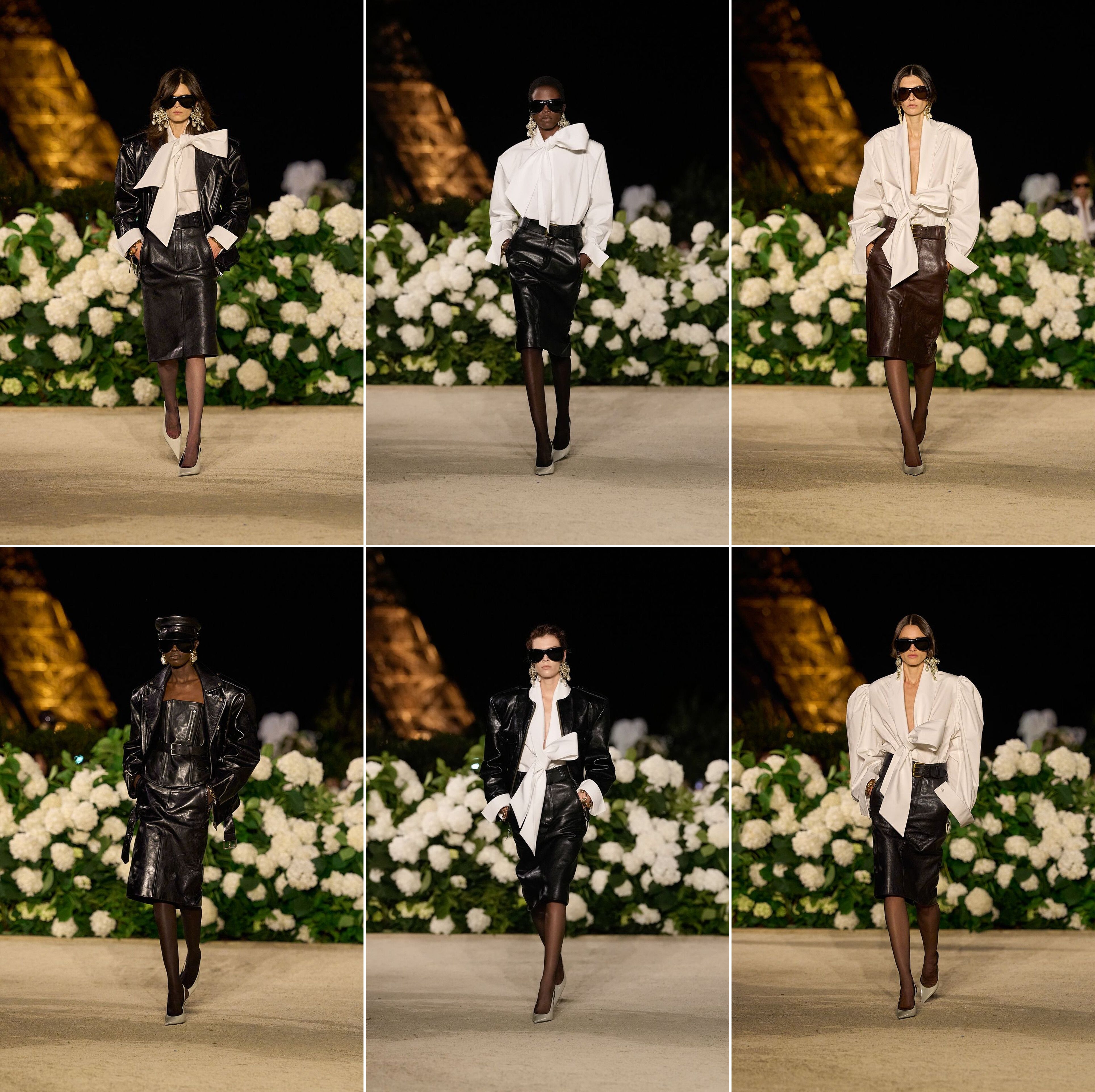 If the camellia is the “eternal symbol” of Chanel, as Karl Lagerfeld called it, the pussy bow holds the same status Saint Laurent. And it couldn’t get any clearer than at the maison’s spring/summer show, staged in front of Paris’s own eternal symbol: the Tour Eiffel. To be sure, Coco Chanel, too, used pussy bows, but it was Yves Saint Laurent who popularised them by incorporating a version into his groundbreaking ‘Le Smoking” tuxedo suit for women in 1967, providing a soft, feminine contrast to the sharply masculine tailoring. And Anthony Vacarello has now gone quite batty over bows, sending massive ones down the runway, but rather than the traditional lavallière (named after Duchess of La Vallière, King Louis XIV’s mistress, who wore it often), those seen at the show had a single knotted loop, but with two ends. A unilateral anomaly.