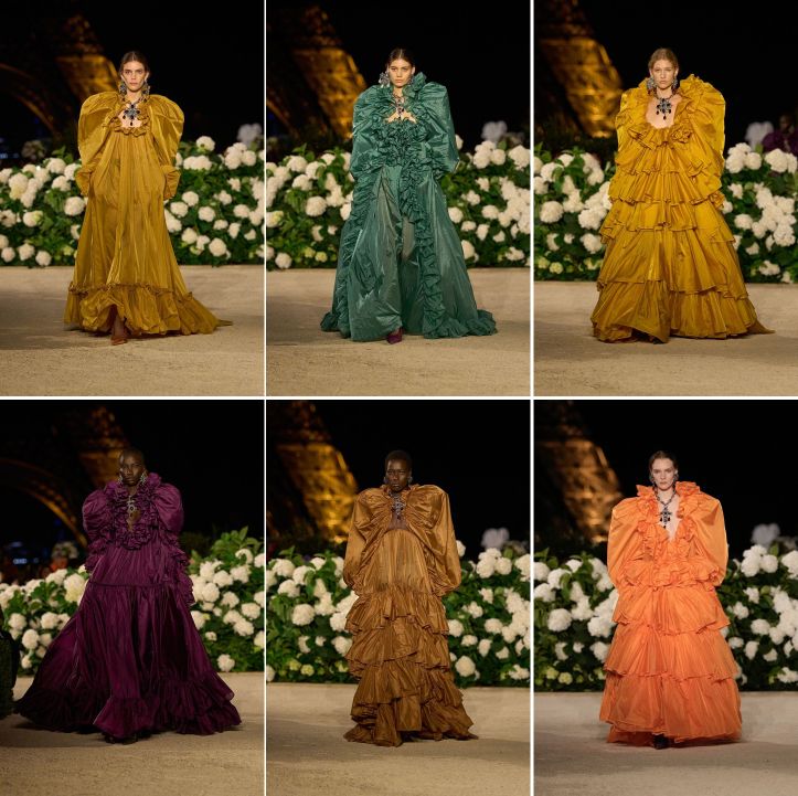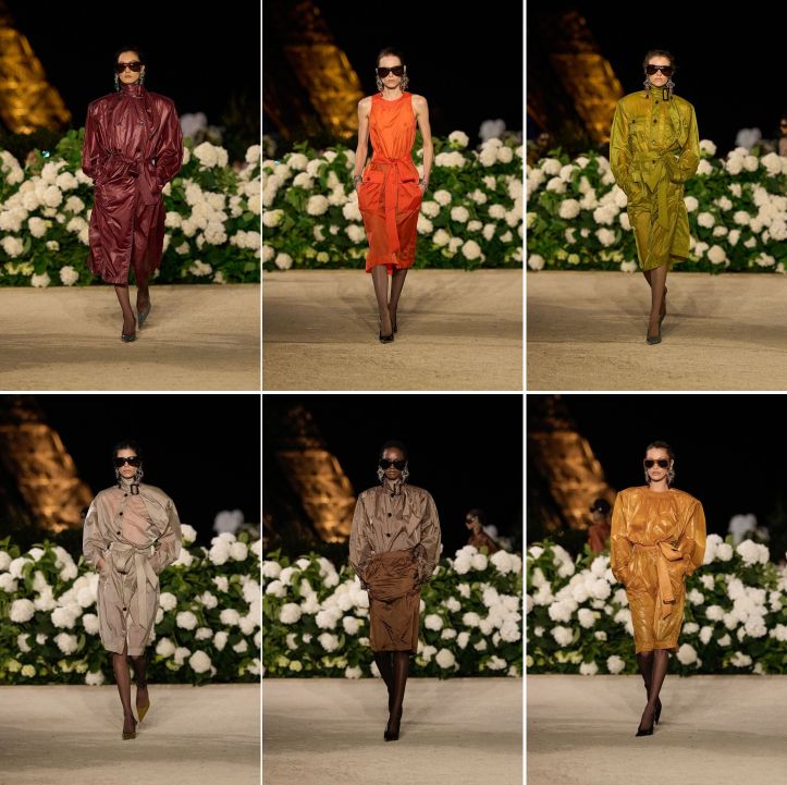 Mr Vacarello ended the last of essentially three segments of the show with another homage, now to ruffles. The final 15 looks used them, as Mr Saint Laurent did, to create a sense of dramatic, maximalist, evening wear, reminiscent of the house in the ’80s, only now the gowns were more voluminous, more ruffled, more dioramic. Engineered with Watteau pleats at the nape, the dresses gained massive volume, tenting and floating with considerable drama as the models strode. And the unevening colours: ground spice and dried fruit. What emerged as mere evocation achieved remarkable sublimation. Anthony Vacarello has truly remained in a protracted, respectful homage mode. This commitment is remarkable, given the current compulsion to remake a house almost completely. He is probably one of the few designers at luxury maisons still respectful of house codes. That fidelity alone commands admiration.