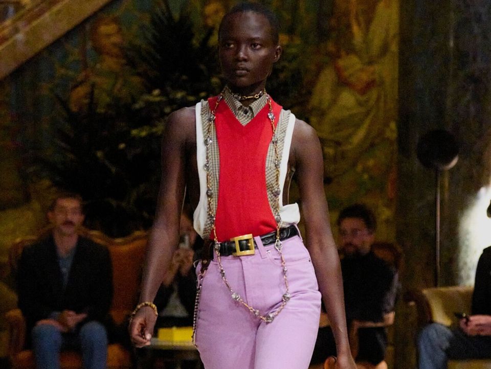 The visible result of the corporate un-sequel is, to us, best described as the Miu Miu-ification of Versace. Fresh from his role defining the intellectual, deliberately awkward, ‘cool girl’ aesthetic at Prada’s sister-brand, Mr Vitale did not put himself through a decompression chamber before working on Versace. We had thought he would balance Donatella Versace’s legacy with his own vision, and potentially navigate a creative direction that satisfies the new corporate structure and existing Versace custoers. But he did not. Out went the glossy, bombshell, Amazonian glamour; in came a new, almost aggressive kind of realism that re-contextualized the early Gianni Versace archives, opting to highlight unflattering high-waisted denim jeans and their lumpy crotches; the barely tanks tops; and slouchy power-suiting. This seemed to us that he wanted to be seen as a successor to Gianni Versace, not his little sister.