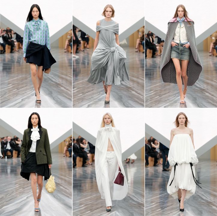 Some details followed a clear thread from his earlier Dior men’s—the most unambiguous were the removable, choker-like bow ties, now made in the same fabric as the shirts, but still throttled. And the “side-looped flanges”, inspired by the stiff architecture of a 1948 Dior couture dress, Cigale. The transplant, initially seen at the rear of cargo skorts, now appeared on trenchcoats and on skirts. As with the men’s show, Mr Anderson offered a transfigured Bar Suit—it was truncated and slightly tented in the rear. There was also the version with oval cutouts on each side of the jacket’s front, just above the hem. Curious was one look—it appeared to appeal to women who enjoy a good tee-off: a baby polo shirt with set-in sleeves, worn with pleated chinos. The logic of its inclusion remains opaque. As the finale came on, it was clear that there was a lot to see. Perhaps, a tad too much, making it impossible to rank the highlights without feeling directionally challenged.