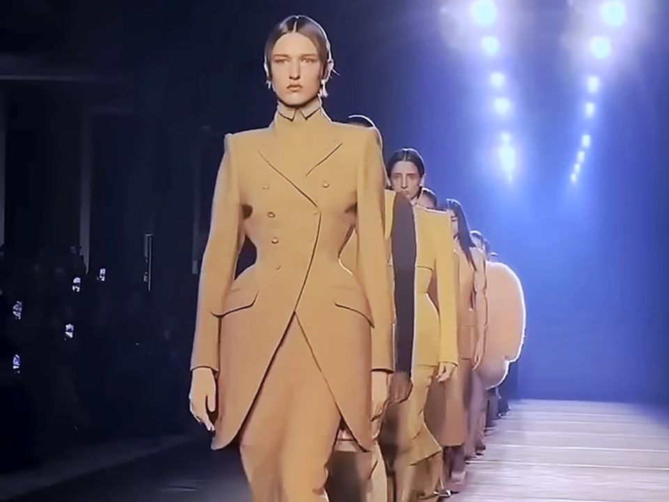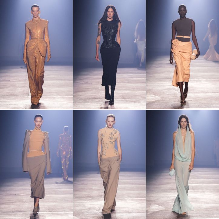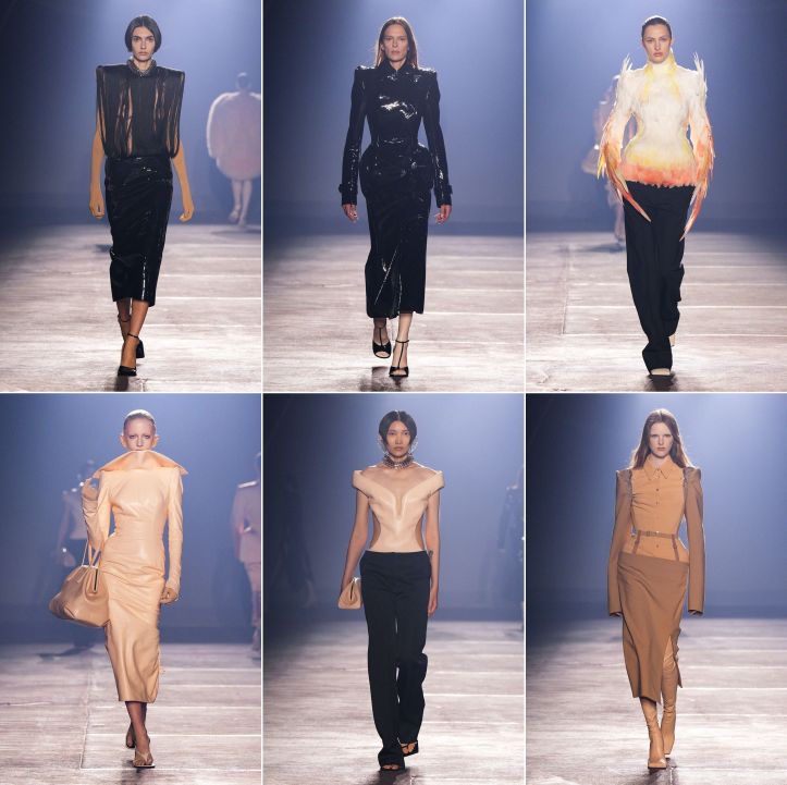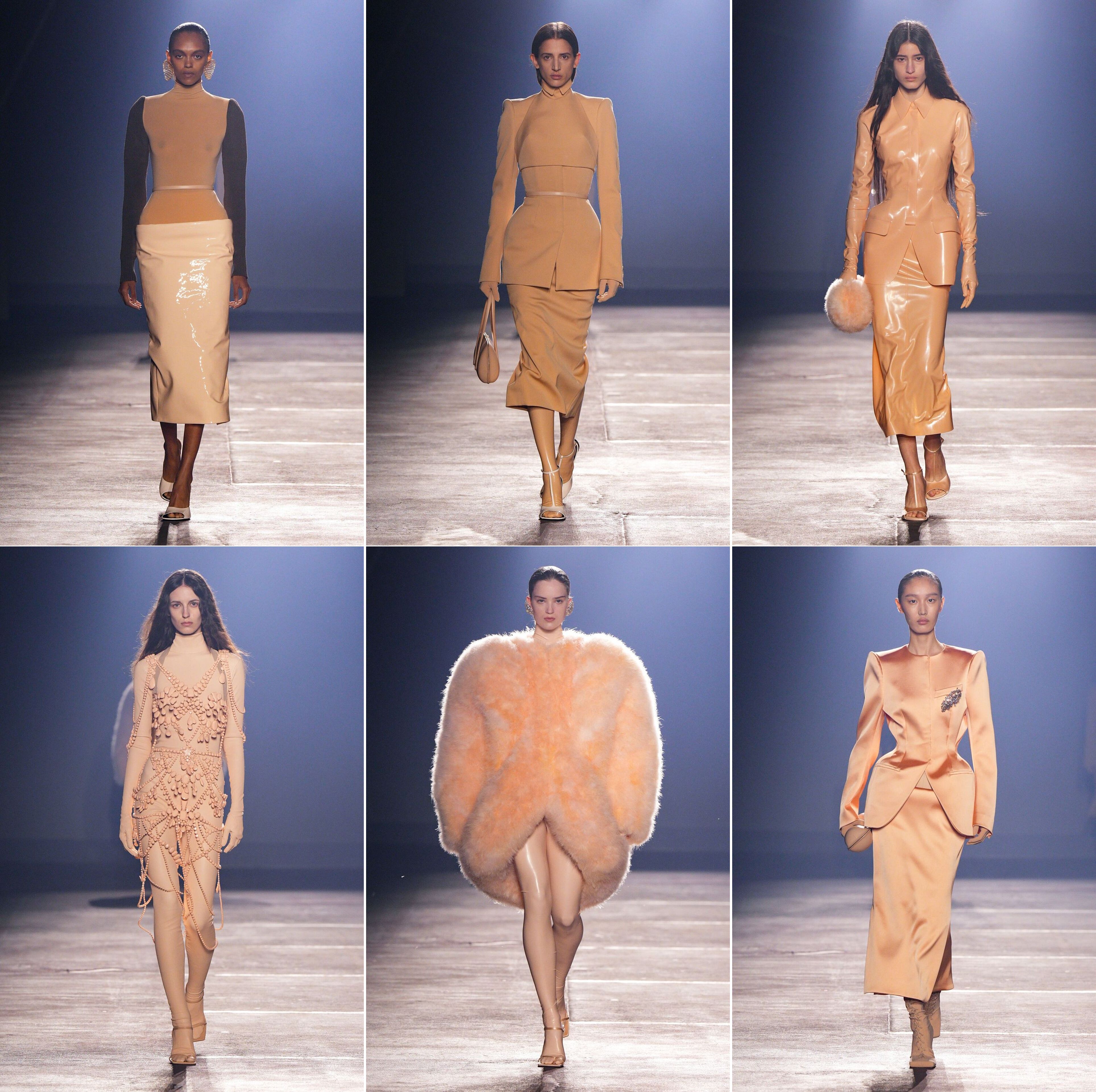 The technical mastery required to articulate forms that were both provocative and evocative, where skin and structure were a sweet spot of creative tension, is the expected result of a résumé built in the atelier. However, what did not work for us was the odd colour palette, the dominance of that shade: What do you call the colour? Tan? Fawn? Nude? A uniformity of the underwear drawer? Or Giambattista Valli’s predictable neutrals? This unexpected emphasis on what could be a beige of a bureaucratic persuasion felt like unnecessary creative compromise. It seemed that, while Miguel Castro Freitas has mastered the Mugler femme fatale or “showgirl”, as it were, he has yet to fully commit to the house’s more persuasive chroma-as-drama.