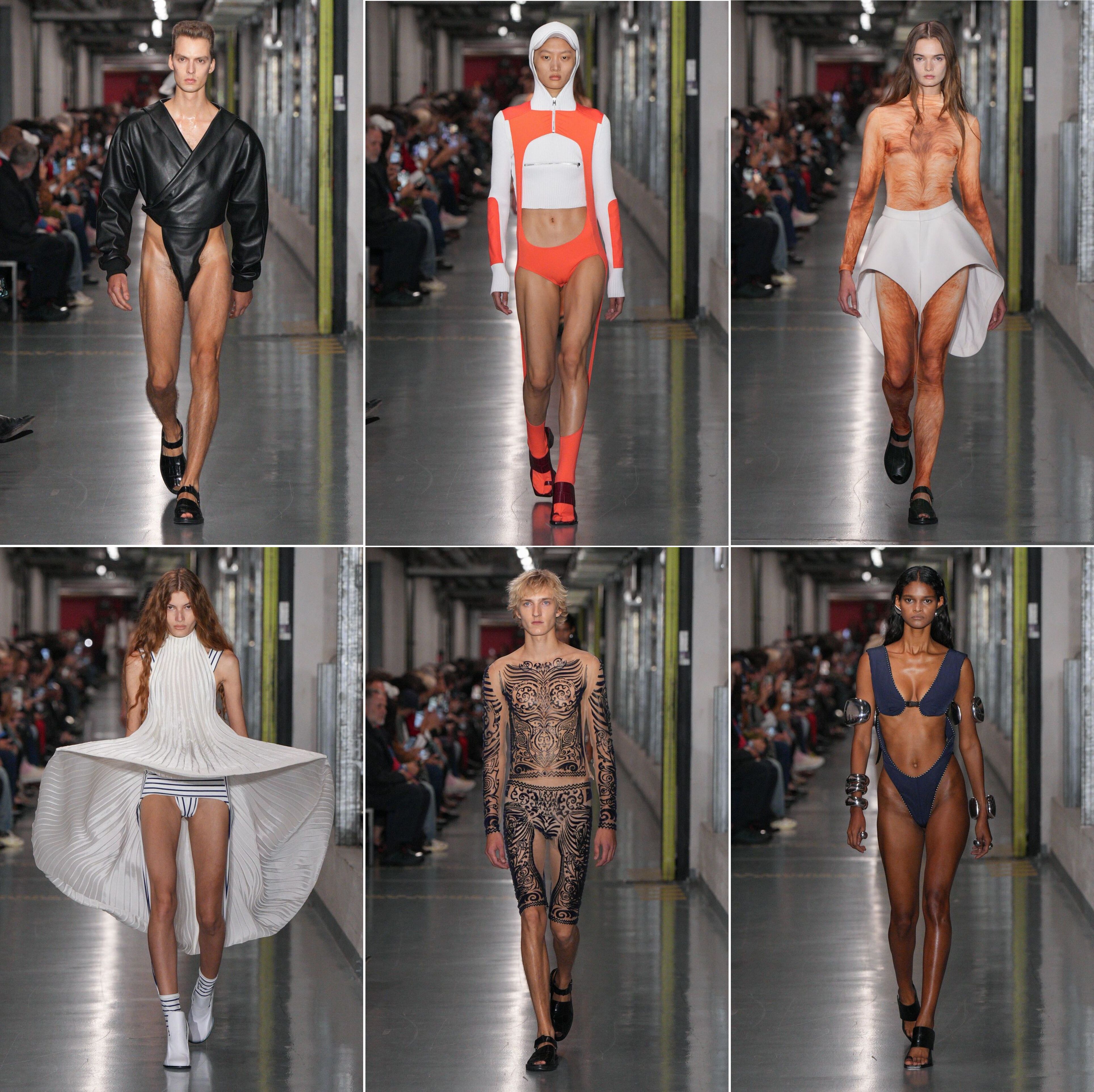 While showing loads of skin was expected, it was the embrace of maximum exposure ensembles that defined the collection. Mr Lantink’s recent history suggested that fabric would, once again, be used to suggest it is optional. At his own Fall/Winter 2025 collection, titled Duranimal, the show opened with a female model wearing a highly-sculpted prosthetic male torso (with abs). It then closed with a male model in a top that was essentially large, jiggling prosthetic female breasts—a show-and-tell that made the news globally. That kind of in-your-face provocation had, in fact, struck earlier. Back in 2018, he designed trousers for the Janelle Monáe music video for Pynk with in-seams that look like the female sexual organs so that when the singer and her dancers pranced they show pudendal dilation. That he is focused on highly-sexualized, and literal body-centric fashion is perhaps grossly understating it.