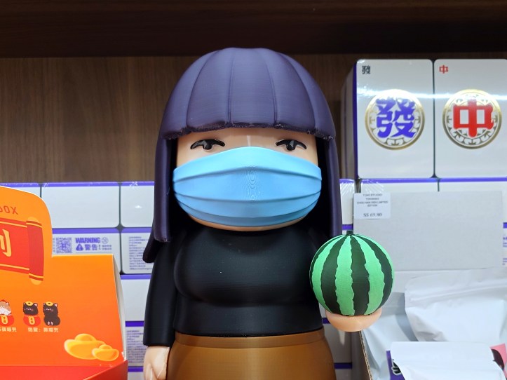 I was happy to meet Sister Hong, but it was her maker that fascinated me. This was a local product, produced not in China, but by a Singaporean 3-D printing company, Studio Toki. A salesman from the toy store told me that only 50 pieces were made, and her fans were so many that there were now only three left. In fact, the resin Sister Hong was launched on 20 August, 11 days after National Day. Crucially, this is not a blind box, so what you see is what you get, unlike, regrettably, the Sister herself. Inside each box, apart from the doll, there is a replacement full-head and an extra wig so that she can go back to being he, a bottle of cooking oil, an apple, and a pair of bananas, in case she no longer craved watermelons. But best of all, there is a separate companion for her, when she needs to have one. And he is none other than 臭男人 (chounanren, stinky man)—the “since I am here” scoundrel himself!