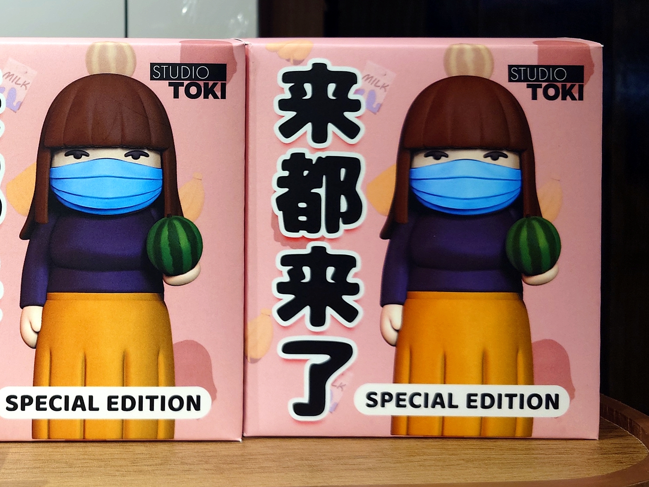 I was happy to meet Sister Hong, but it was her maker that fascinated me. This was a local product, produced not in China, but by a Singaporean 3-D printing company, Studio Toki. A salesman from the toy store told me that only 50 pieces were made, and her fans were so many that there were now only three left. In fact, the resin Sister Hong was launched on 20 August, 11 days after National Day. Crucially, this is not a blind box, so what you see is what you get, unlike, regrettably, the Sister herself. Inside each box, apart from the doll, there is a replacement full-head and an extra wig so that she can go back to being he, a bottle of cooking oil, an apple, and a pair of bananas, in case she no longer craved watermelons. But best of all, there is a separate companion for her, when she needs to have one. And he is none other than 臭男人 (chounanren, stinky man)—the “since I am here” scoundrel himself!