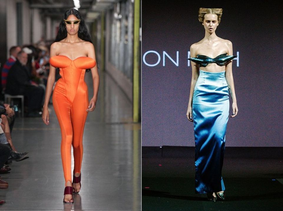 While the end results of both designer’s reimagining of the conical bra are different, one thing is oddly similar: the outward, splayed positioning of the ‘cups’. This is the definitive shift from the classic, front-facing, vertex threat of the Gaultier era to a new kind of defense. The original cone was a focused shield of defiance; the current splayed silhouette is a three-dimensional deterrence. We don’t know if either of them speak for feminism. If it does, it is not the feminism of subtle power or intellectual argument. It is a maximalist, in-your-face, confrontational feminism that equates power with visibility and physical presence. While Dickson Mah delivered this message with the clarity of technological command, Duran Lantink used absurdist humour to declare that the body is simply raw material, a canvas for incitement-chic that is entirely self-owned and aggressively unbounded. The splayed torpedo is a transatlantic declaration: the feminine form is now an active projection of power.