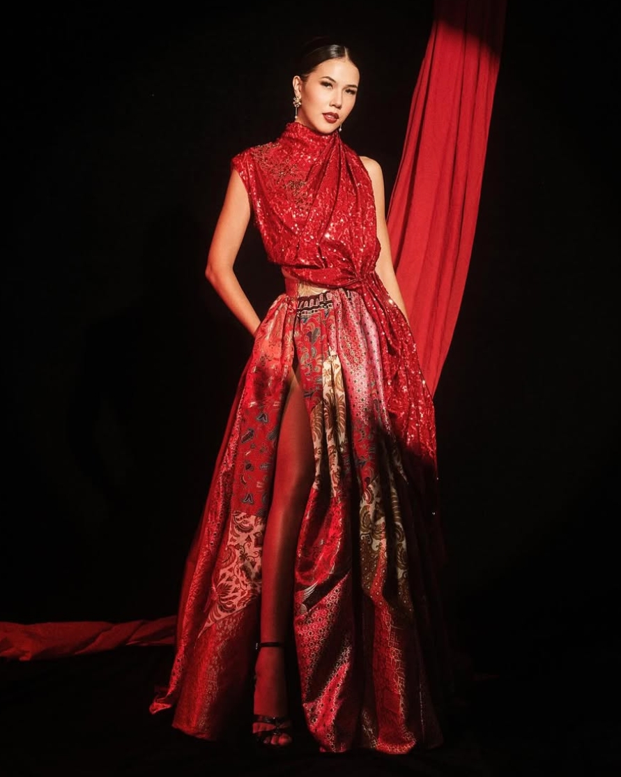 If pageant costumes are built for spectacle, Josiah Chua’s gown is somewhat prosaic. It not only completely lacks the expected wow factor, it feels like it forgot there was a wow factor to begin with. The blouse is messy, the skirt looks deflated—a curtain of mixed fabrics, panelled like home-made Chinese New Year lanterns, drawn at the waist, and, in sum, appeared more like the day after. The “SG60” theme has potential for futurist flair or infrastructural drama. Instead, we got a hongbao ensemble that looks like it has been through a long National Day parade and needed electrolytes. What Mr Chia aimed for is diplomacy through cloth—safe and legible, but with zero emotional wattage. When will we move beyond ancestry to express audacity? Or are we happy to have a costume that doesn’t ask what it means to be Singaporean now, but just reaffirm what it meant in 1965?