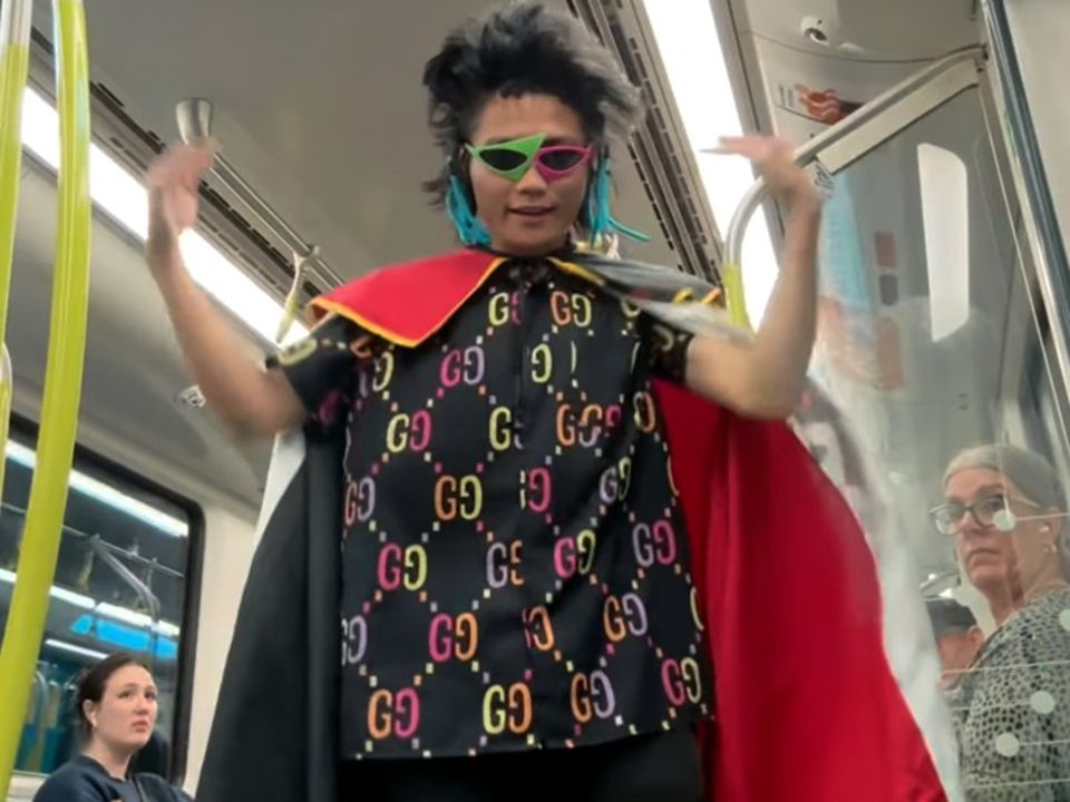 Johnson Wen in an odd get-up that includes what looks like a fake Gucci T-shirt during one of his stunts, this time in public transport. Photo: pyjamamann/Instagram