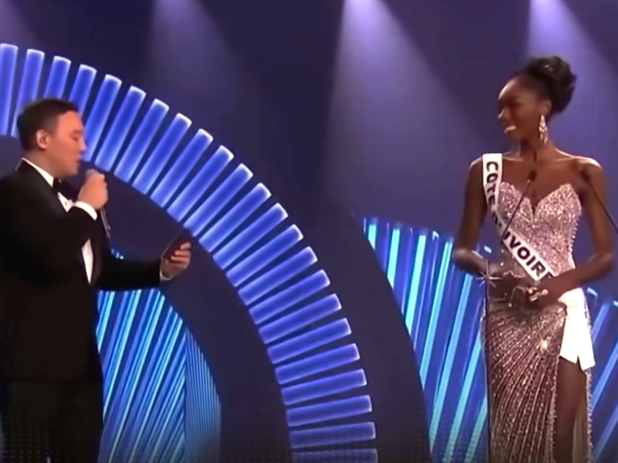 Miss Universe Côte d‘Ivoire Olivia Yacé receiving her final question. Screen shot: oliviayace/Instagram