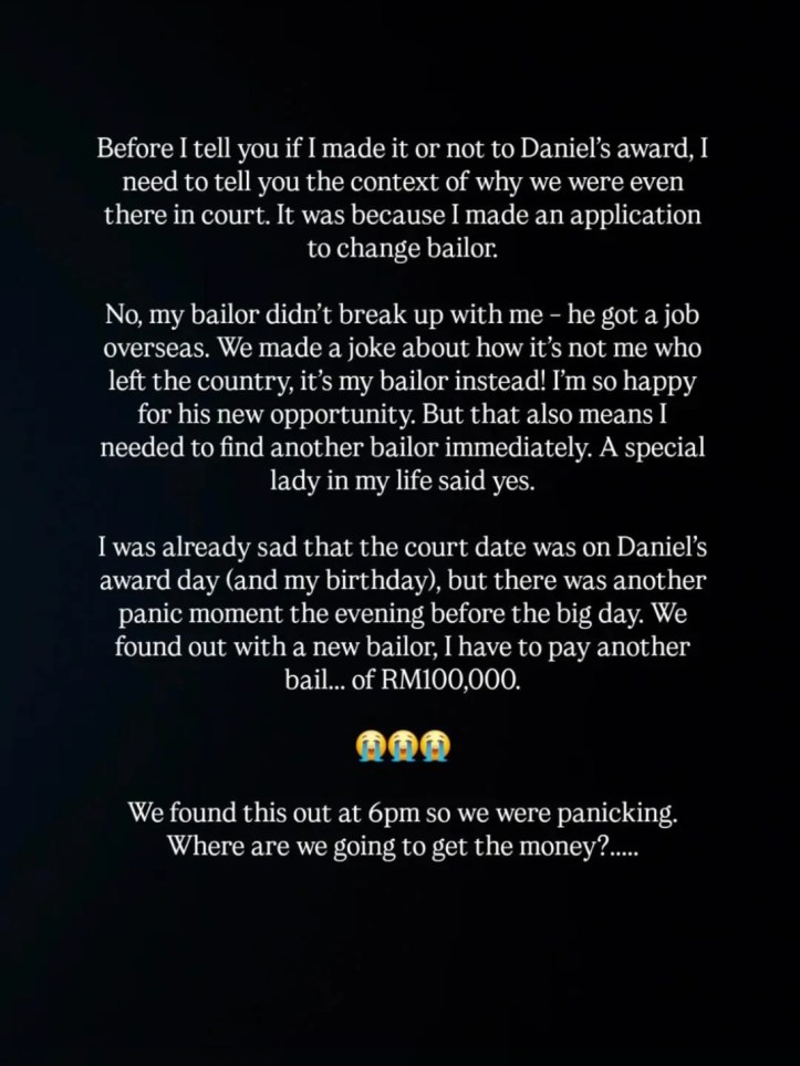 We are also told that her new bailor is “a special lady in my life”. Now, the bailor is not just a guarantor. She is conferred “a special lady”, which makes the legal requirement feel like a touching relationship moment. It is influencer speak for intimacy or someone important, leaning on what is known as “feminised sentimentality”, nudging her followers to admire the bailor’s sacrifice and, equally, the defendant’s gratitude. But the latest bailor is not merely a different person. It comes with a new RM100,000 (or about SGD31,609) bail, which led to Ms Yusof‘s self-broadcast consternation. “We found this out at 6pm so we were panicking. Where are we going to get the money?” The mention of the bailor change is clearly a plot device. Without it, the panic over RM100,000 bail has no setup.