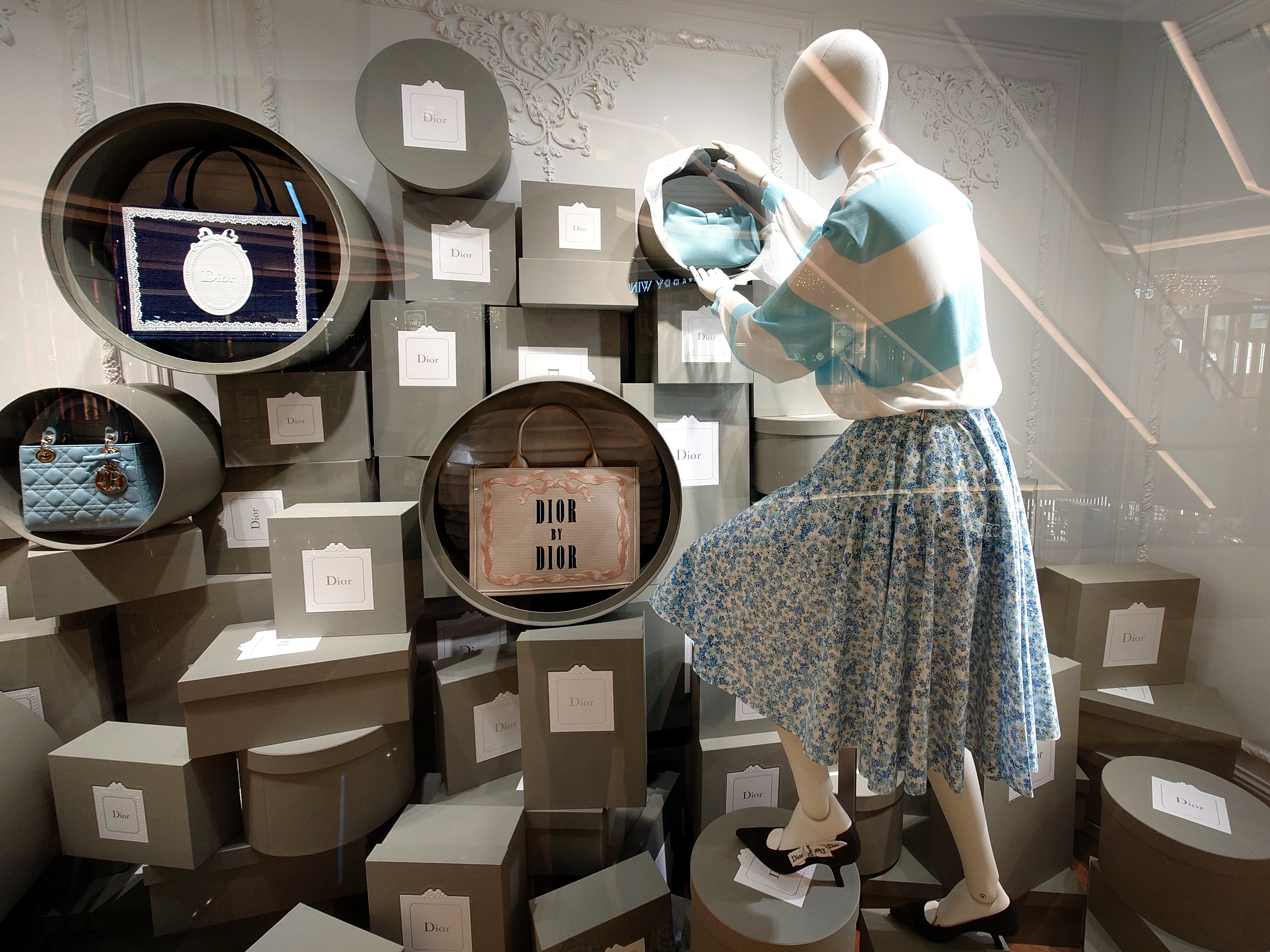 For a major overhaul, it is hard to pinpoint what Dior’s fashion message under Jonathan Anderson is with this window (to be sure, some others in different stores do show mannequins facing front, but they provide little extra clarity on the brand’s direction). The dummy, in what could be a Degas moment, was dressed in the maison’s ‘Marinière’ cotton-knit top that had less a nautical vibe than that associated with the rugby polo shirt and a micro-floral cotton muslin skirt that could have come straight out of Liberty’s department store. She is shod in a pair of J’Adior pumps, with the ribbons that looked like part of the brand’s gift wrapping service. There is a surprisingly aggressive vacuity to the look. It is not clear which matters more: hemline or bottom line. Might this be for those who find the Gap too avant-garde?