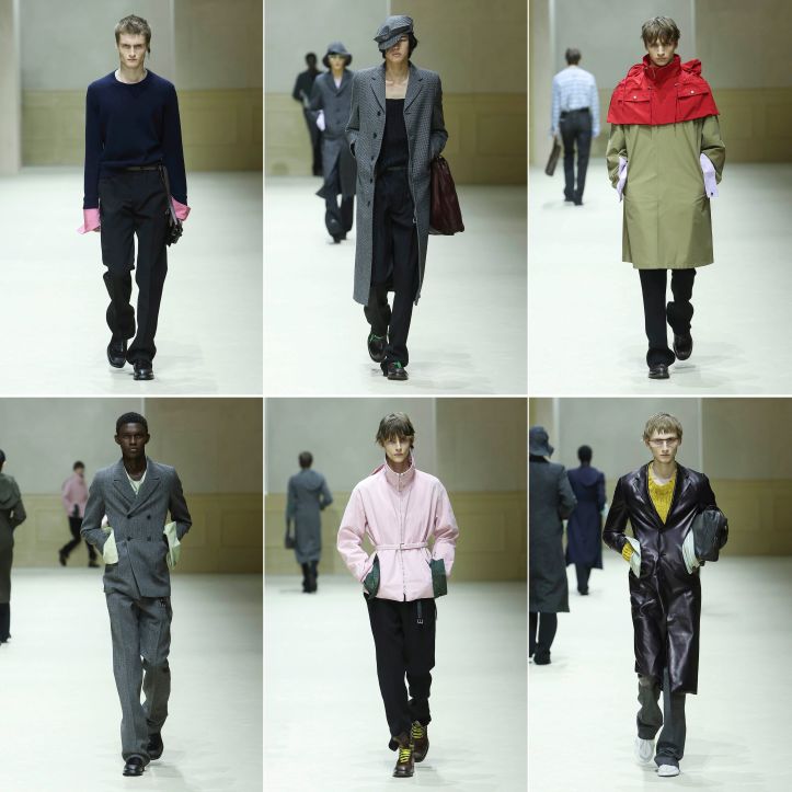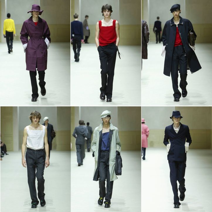 This could be the “archeology” of Prada: digging to unearth gems from vintage Sunday morning cartoons to southeast Asian heirlooms, thankfully without references so direct that they could be immediately called unthinking appropriation. Prada remained the master of the high-low, global-local synthesis. But perhaps the most charming this season was the headwear, especially the flattened charter or bucket hats attached (velcro-ed?) to the right side of the back, where the shoulder blade was or where The North Face frequently positions its three-line logotype. To us, this brought to mind the evocative womenswear of spring/summer 2011’s Baroque show, when massive sombreros were worn like nagas protecting the cheerfully togged models. Sure, for the guys now, the hats were smaller (not larger than a face) and quirkily pancaked. Like the sombreros from fifteen years ago, the styling had them still positioned in the rear, but off-center, as if wearing a brooch. Could this be some kind of oversized back boutonniere? A visual signature as potent as Prada’s own inverted triangle? Whatever the case, hats never needed to be on the head alone. Prada, of course, knew that.