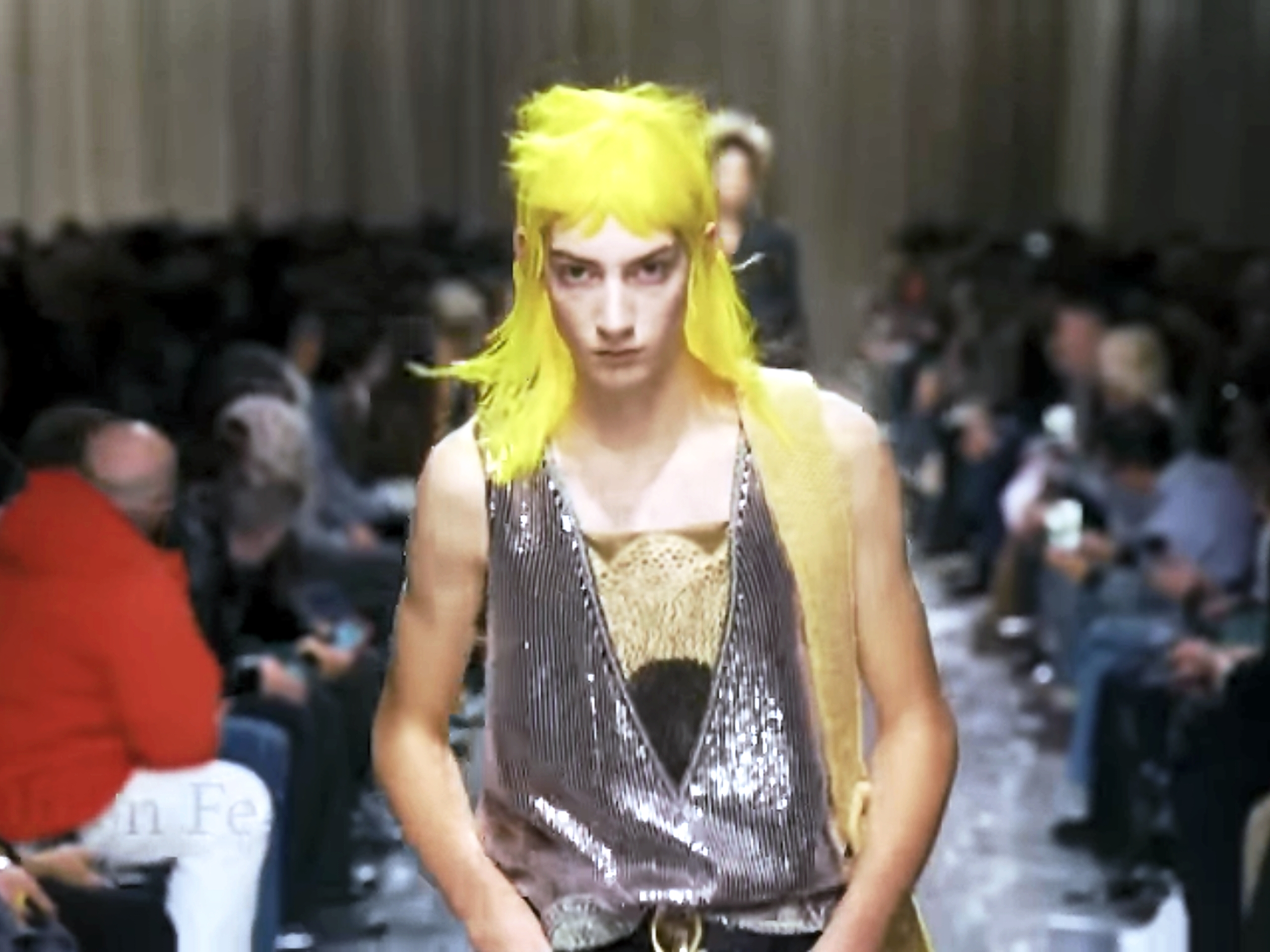The show started on a wrong note for us. No, not the first of the indie-ish soundtrack, Alexis, by L.A. musician Mk.gee (who made Mr Anderson’s acquaintance in his hometown not too long ago). Rather, it was the lurid tank top with the fake art deco composition of lace and sequins that got to us. This was very Mustafa. Or, if a more upmarket comparison is required, a fashion student discovering and dabbling in luridness for the first time. Mr Anderson wanted to chuck the calculated surrealism of Loewe—we understand, but the deliberate attempt at ugly-chic that did not land, we do not. Even mullets in the yellow of SpongeBob SquarePants were surface level provocation, if you can even call them that. This was truly Loewer than expected. We did, however, admire the sheer athleticism required to limbo under a bar that he has dipped to barely floating above the floor.