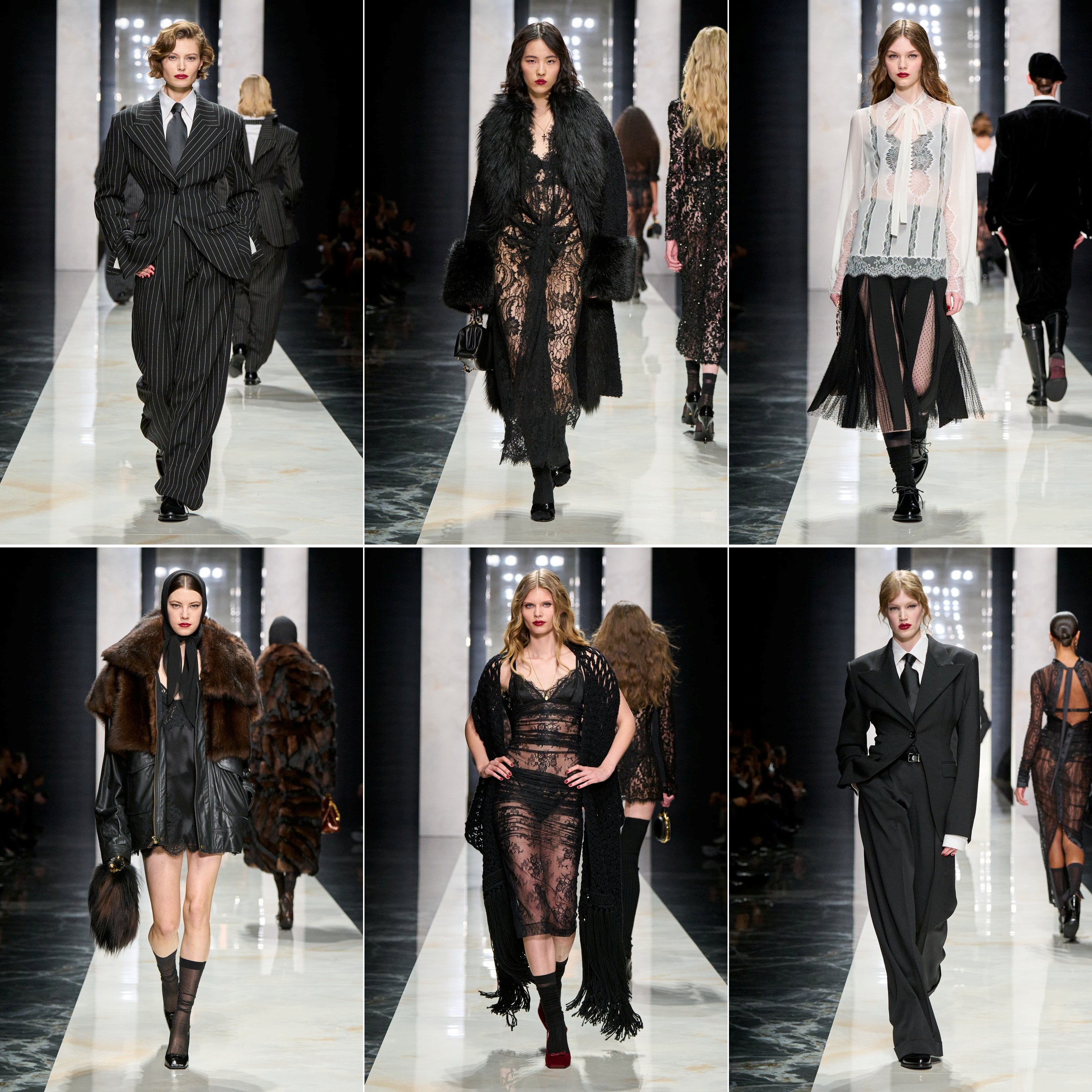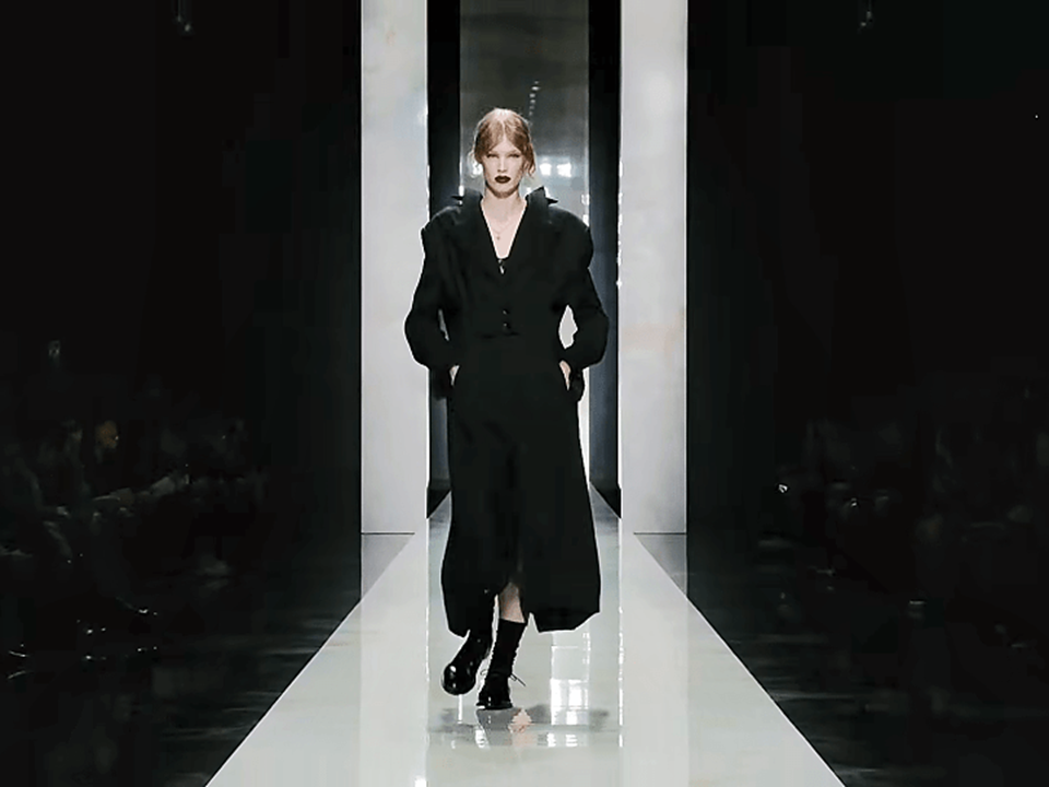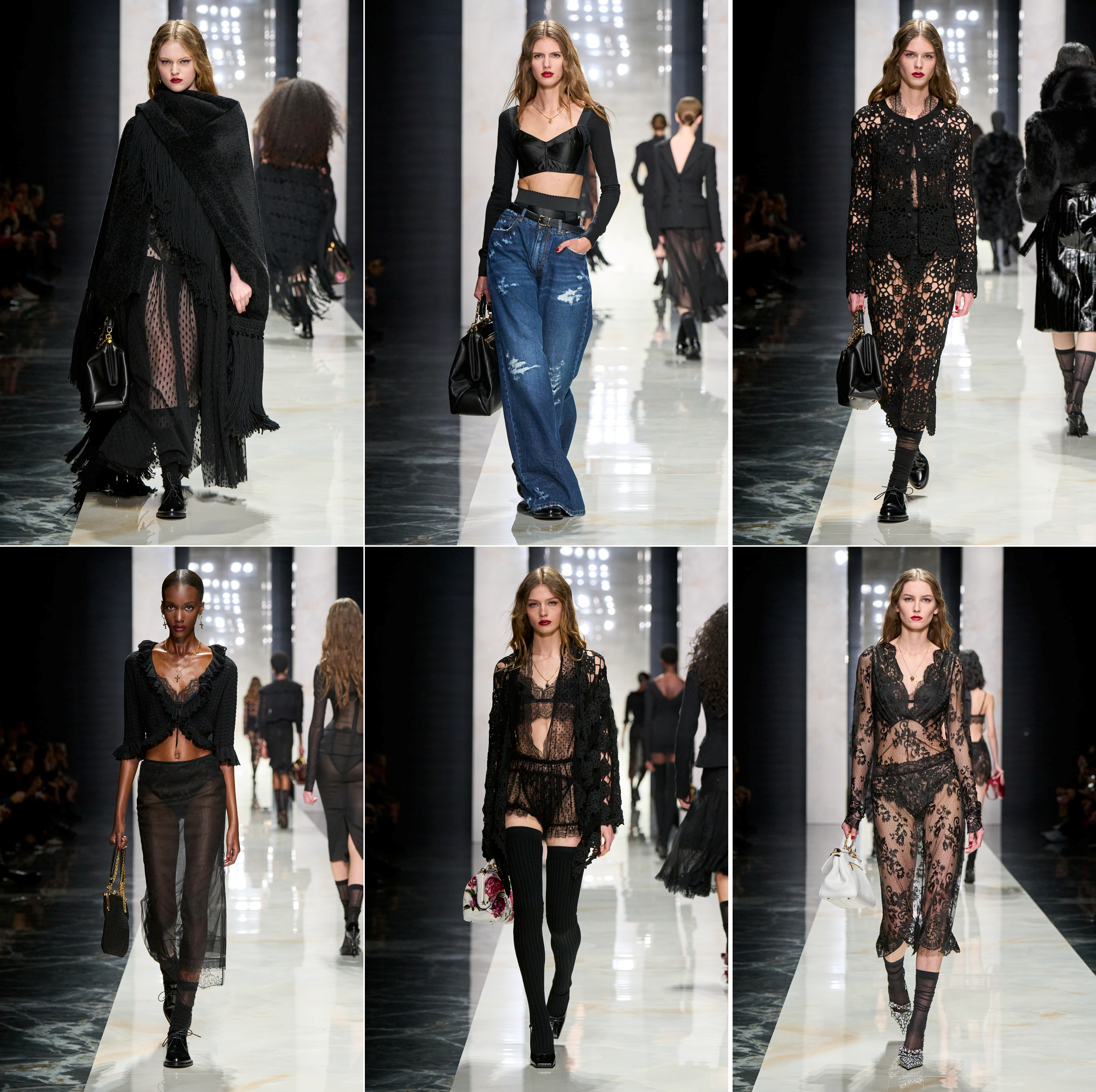 Domenico Dolce and Stefano Gabbana basically hit copy-paste on their greatest hits—pinstripes, lace, and those early 2000s distressed jeans with blazers or tiny tops—even when they were insistent that “this is not nostalgia”. It was, as we were expected to believe, collectively “Sicily as emotion, black as strength, lace as intimacy” and, as we mentioned earlier, “tailoring as authority”. The show opened with clothes that could really be worn to a funerale, more of the house’s theatrical Catholic mourning that turned grief into glamour. The widow became not just a costume, but a grotesque echo of real-world mourning. Insisting on stylised bereavement suddenly feels hollow, almost parodic, when contrasted with the immediacy of deaths from war. In Italy, the widow is an icon of dignity, but to D&G, she is a worshiped heroine. On one hand, she represents resilience and matriarchal strength; on the other, she reduces Sicilian culture to a theatrical cliché and, now, an on-going war to a minor inconvenience that luckily provided the perfect somber chiaroscuro lighting, as identified by the house, a Renaissance-style light setup, for her pleased profile.