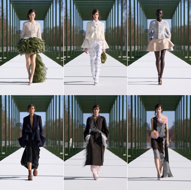 The desire to dominate the environment extended to the frothy collection. If the pond was a simulation of nature, the clothes were a simulation of the past to allow imthe present to look current. And a confusion of the seasons. But we do know that these days, winter can be summer, and vice versa. Who cares about keeping warm when you have fashion to supplicate to? Or the unseasonal weather? In fact, Mr Anderson kept things light and buoyant. This is achieved through the flouncy strata, mostly skirts that did more flirting than a loose lace of a corset. Short and thigh-skimming, the skirts carried a defiant volume, channeling either a child’s fashion fantasy or a ballerina with an unfortunate take on the tutu.. This could be Dior pushing through the surfeit of the sheer of the past for the statement skirt, like dahlias pushing through dense foliage in late summer. Or, if we keep to the theme, water lilies emerging from the mud. But even coming up from the sludge, the bloom remains pristine. The Dior skirts, admittedly, had a freshness about them. A bud no longer budding, yet was still beguiling, like the titan arum meeting its admirer for the first time. Whether tiered as loosely as the 牡丹 (moudan, or Chinese peonies) or casually cocooned like a tulip, Mr Anderson gave sufficient reasons for a serious flounce-finding mission.