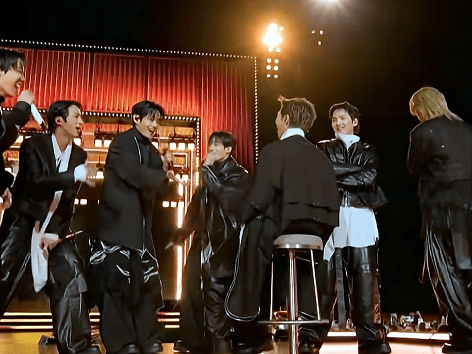 Perhaps the members of BTS also armoured themselves against the passage of time. When they started in 2013, they were teens—Jungkook, the youngest was just 15. But now, at 28 to 32, they had outgrown the guise of adolescence. Armour was needed because they reframed maturity as dignity, shielding them from the “loss of youth” narrative. The spirited clothes, with many faux skirts (essentially airy versions of the ancient Greeks’ pteruges that warriors wore), and tapes and gapes that appeared to have a life of their own, dramatised BTS’s transformation from youthful idols to cultural ambassadors. Blackpink could continue to sell cuteness laced with sexiness, but BTS had to be cloaked with scholarly seriousness. Yet, the guys were still sticking to aegyo (cut). The attempt to project maturity through tailoring with moments of forced cuteness created the uncanny tension: grown men in couture still expressing cute. Fans are conditioned to expect eternal youth, but idols are mortal. The comeback allowed the audiences to confront the passage of time, but the production tried to overwrite it. The ‘boy’ in the band endured.