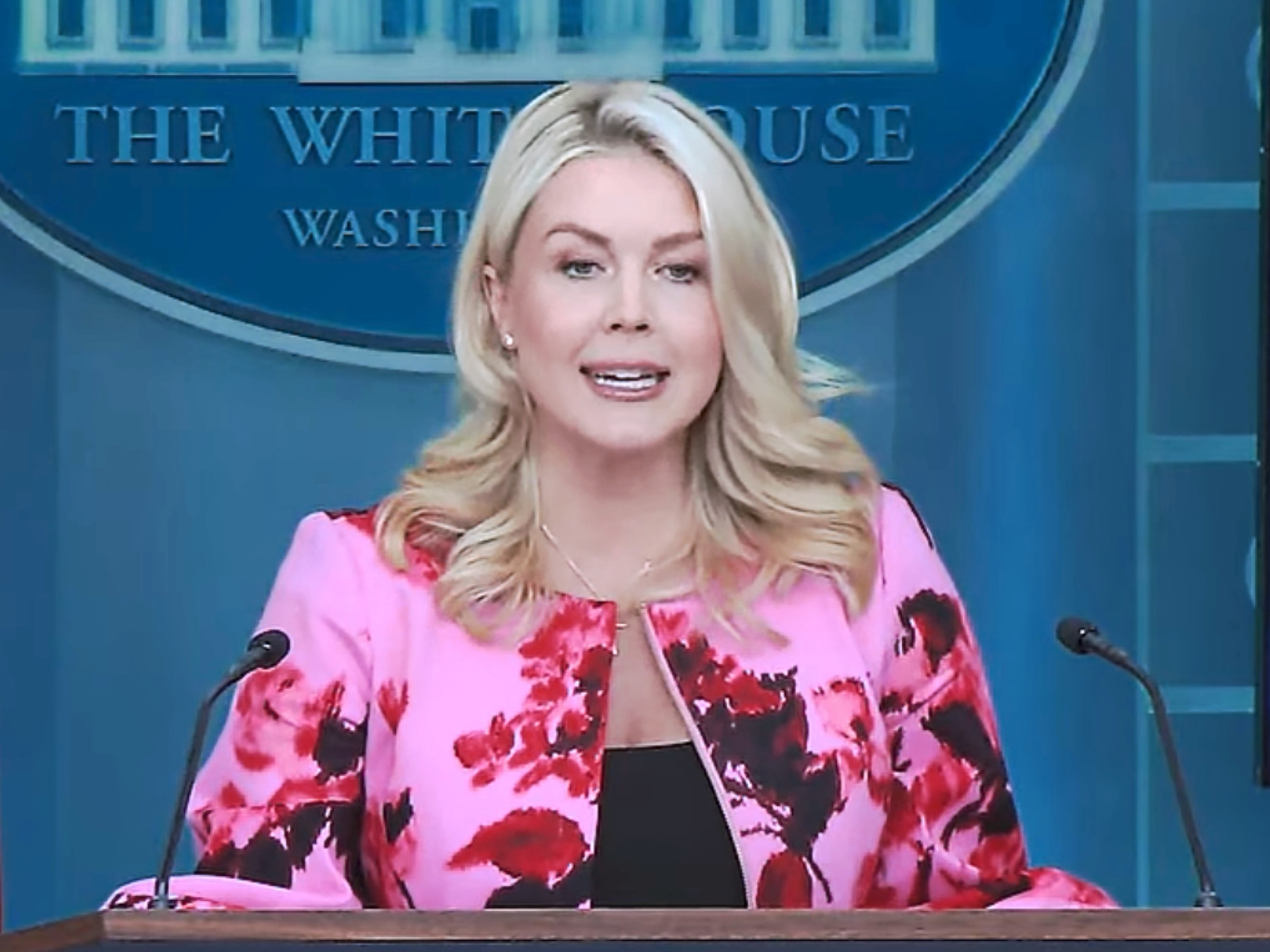 Red flowers on a pink jacket do not soften Karoline Leavitt’s determination to speak with an unburdened mind; they enhanced her comedic flair